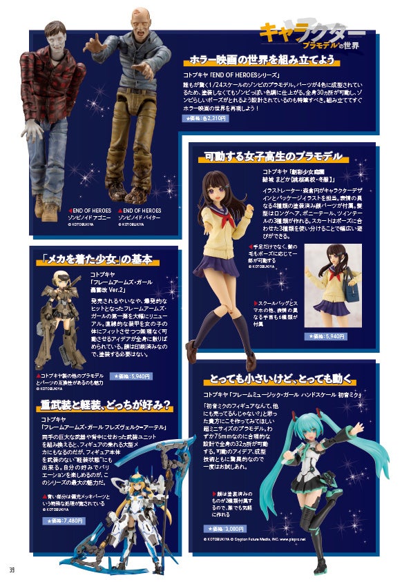 ミリタリー、自動車、飛行機、城、美少女フィギュア、などなど、幅広いプラモデルの世界をカタログ的に紹介。難易度と完成度のキーになるパーツもモデルによっては紹介。メーカーによる違いなども紹介し、キット選びの基礎知識がわかるカタログとなっています。