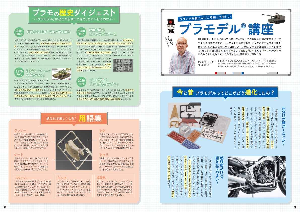 また、プラモデルの製造、組み立て技術が日進月歩で進化を続けているのも見逃せません。キットのディテールは細部まで進化し、反面、初心者向けキットはより親切に。それらプラモデルシーンの最前線を、余すところなく紹介するのがこの一冊です。キット選び方からお店、道具選び、作り方まで、その奥深い世界を凝縮。初心者からベテランまで、必携の一冊となっています。