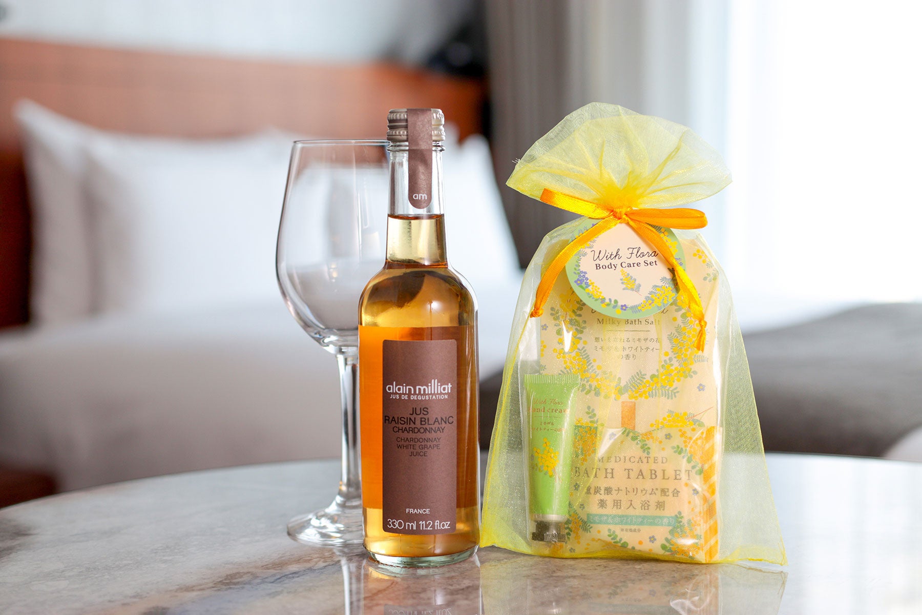 ・ミモザのほんのり甘く軽やかな香りのプチギフト (入浴剤2点・ハンドクリーム1点) 1室につき1セットご用意 ・フランス産プレミアムジュースブランド「アラン・ミリア」 (シャルドネ種 白グレープ) 1名さまにつき1本(330ml) ※ノンアルコール |