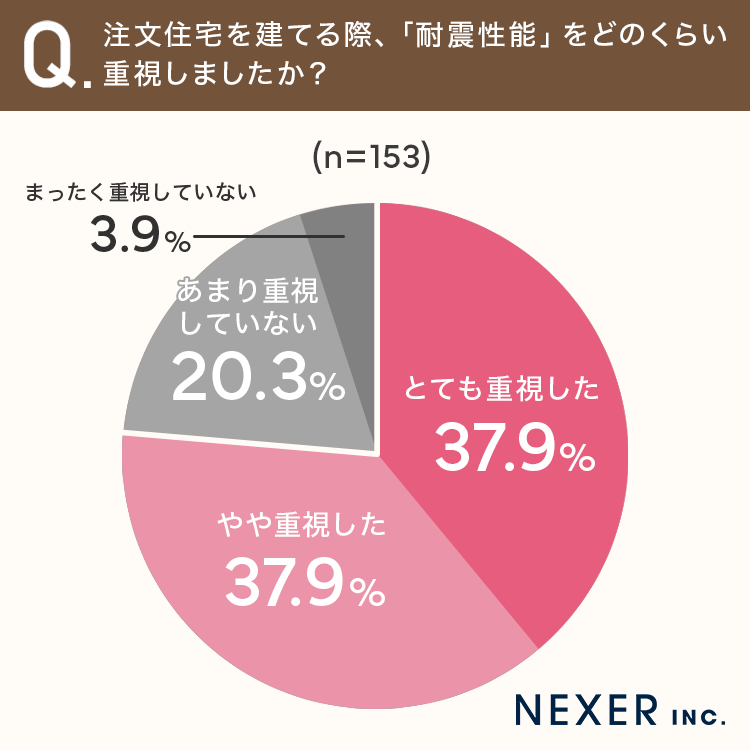 その結果「とても重視した」が37.9%、「やや重視した」が37.9%で、合わせて約76%の方が耐震性能を重視して家づくりに取り組んでいたことがわかりました。一方「あまり重視していない」は20.3%、「まったく重視していない」は3.9%となっています。