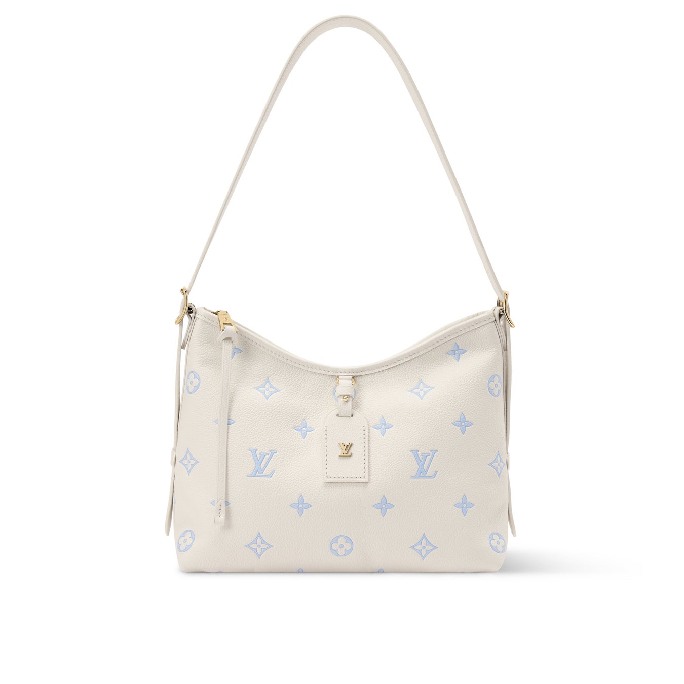 週末のお出かけに活躍する「キャリーオール PM」。必需品に加え、本やサングラスなども収納できるサイズが魅力です。シックなミルキーホワイトとブルーの色合いで仕上げ、明るいゴールドカラーの金具で彩りを添えました。ルイ·ヴィトンのシグネチャーである装飾的なネームタグと、取外し可能なファスナー式ポケットも付属しています。