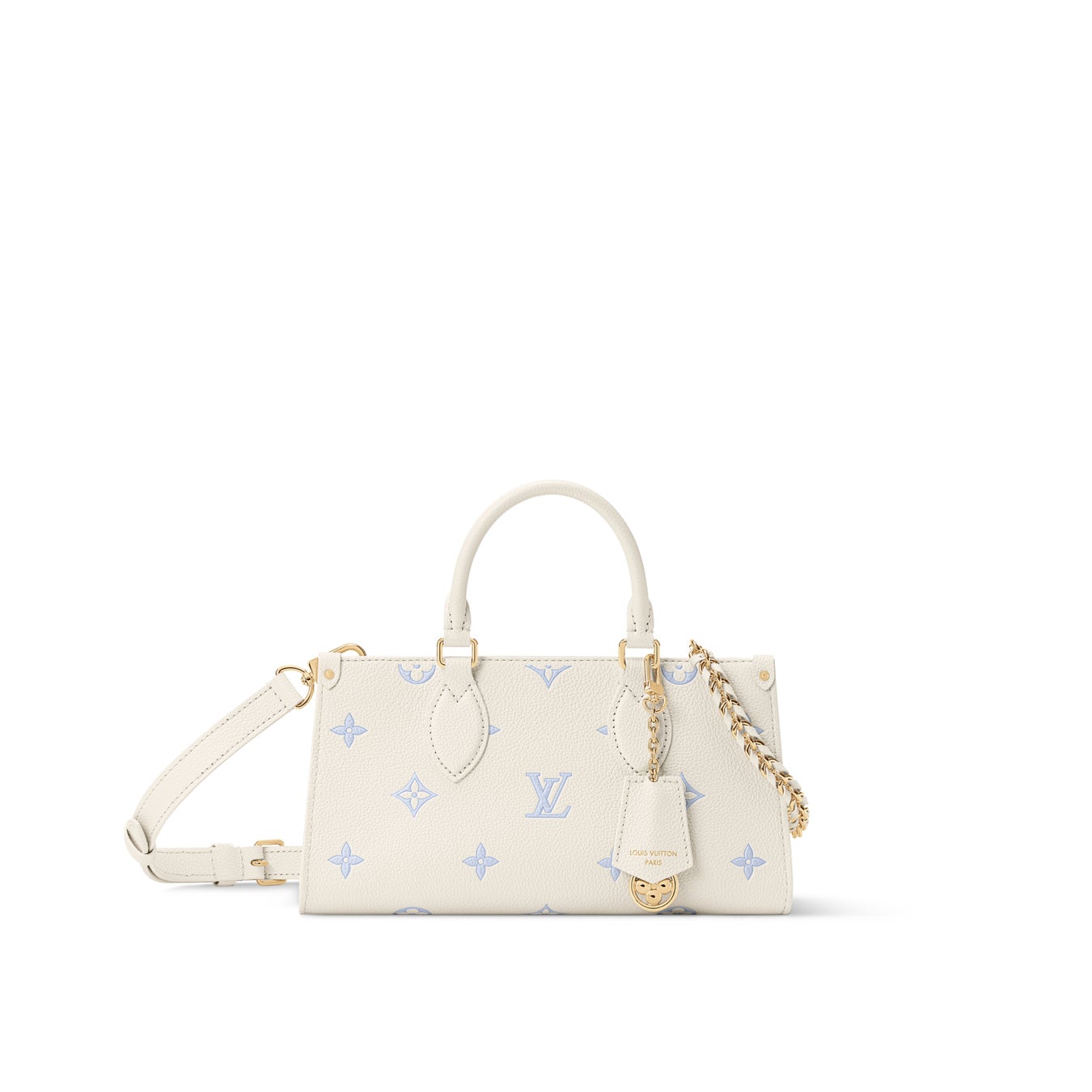 ミルキーホワイトとブルーのシックなバイカラーで再解釈した「ディアヌ」。明るいゴールドカラーの金具をあしらったモダンなスタイルです。取外し可能なLV チャームが華やかさを添え、内装には小物を安全に収納できるフラットなファスナー式ポケットを配しています。