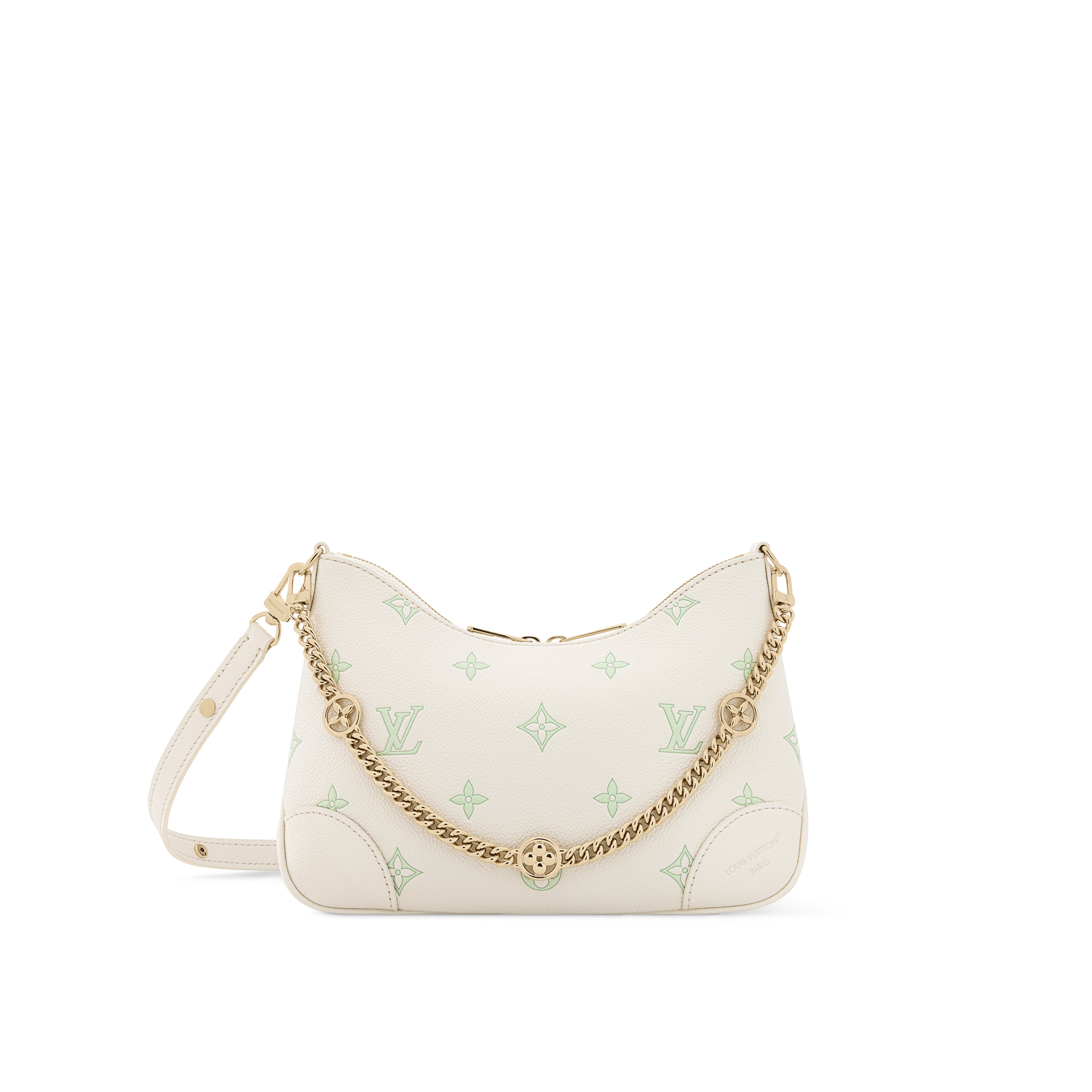 エレガンスとモダンな印象が絶妙なバランスで表現された「ブーローニュ PM」。ミルキーホワイトとグリーンのレザーにシグネチャーであるモノグラムをエンボス加工で施し、明るいゴールドカラーのLV フラワーがあしらわれたチェーンで彩りました。長めのストラップはお好みで取外しでき、内装には日常の小ぶりな必需品を収納できる充分なスペースを備えています。