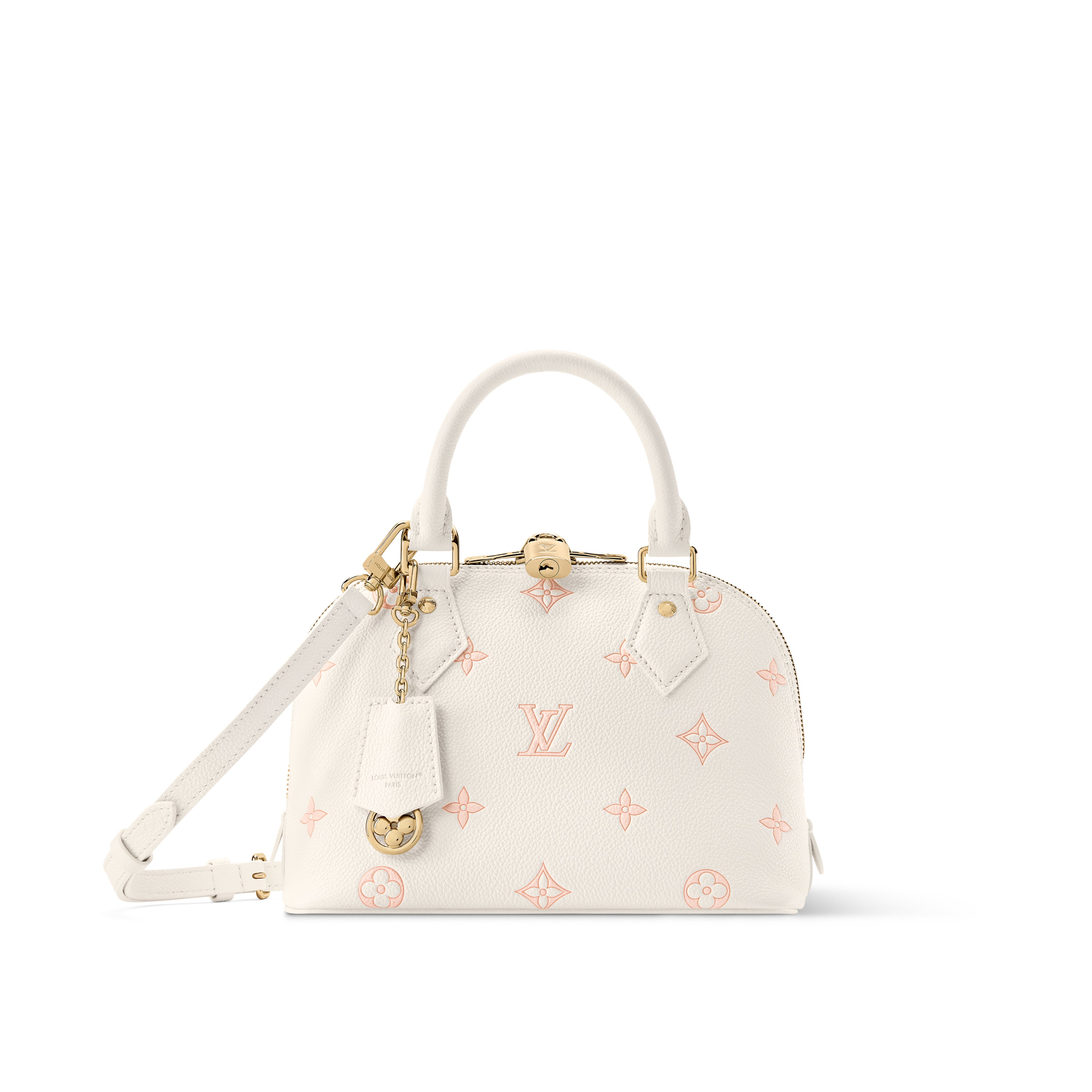 ミルキーホワイトとピーチの色合いが美しく映える「アルマ BB」。ネームタグやパドロック(錠前)などの複数のLV シグネチャーや、遊び心溢れる装飾的なチャームでアクセントをプラス。優美な印象を演出する明るいゴールドカラーの金具を添えた、エレガントなスタイルです。