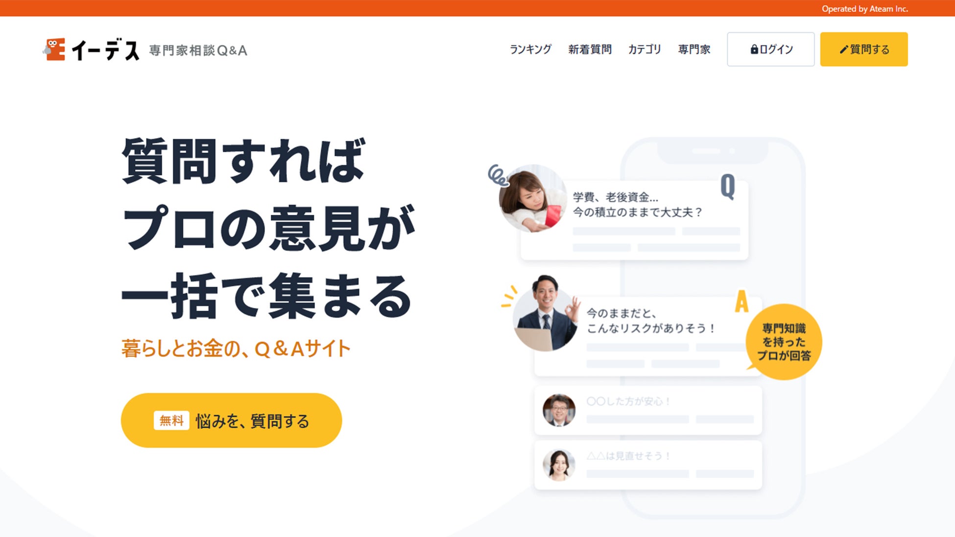 『イーデス 専門家相談Q&A』では、暮らしとお金に関する悩みを質問することで、住宅ローンや資産運用など専門分野ごとに多数の実績がある選りすぐりのファイナンシャルプランナー(FP)の意見を無料で集めることができます。また、過去に同様の悩みを持った経験のあるユーザーからも、アドバイスをもらうことができます。