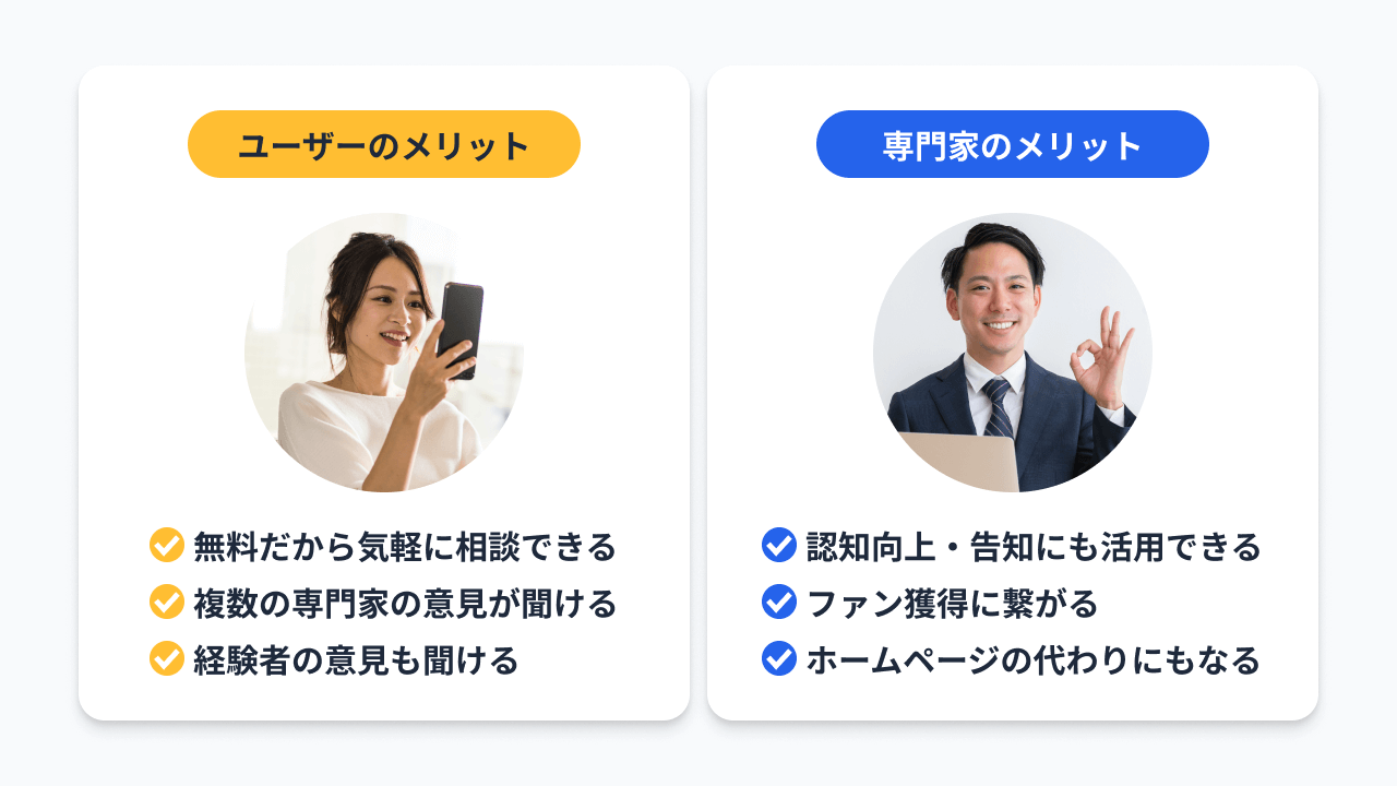 相談したい内容が決まっている人・いない人、どちらの人にも専門的な情報をわかりやすく提供するために、ユーザー自身が悩みを専門家に相談できる場として、専門家相談プラットフォームを立ち上げました。