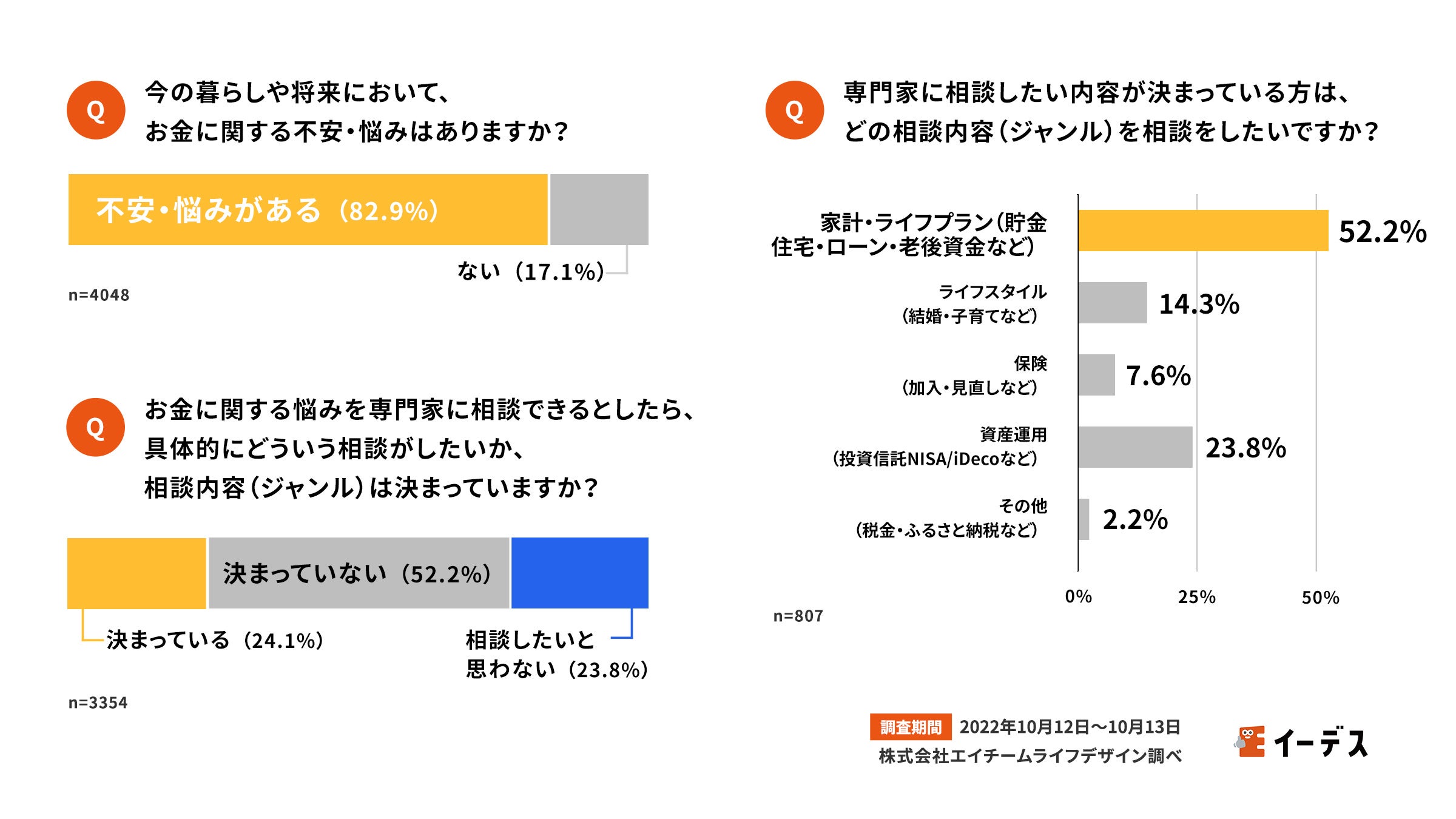 2022年10月に実施した「お金の悩みに関するアンケート調査」によると「今の暮らしや将来において、お金に関する不安や悩みがある」と回答した人は82.9%いることがわかりました。