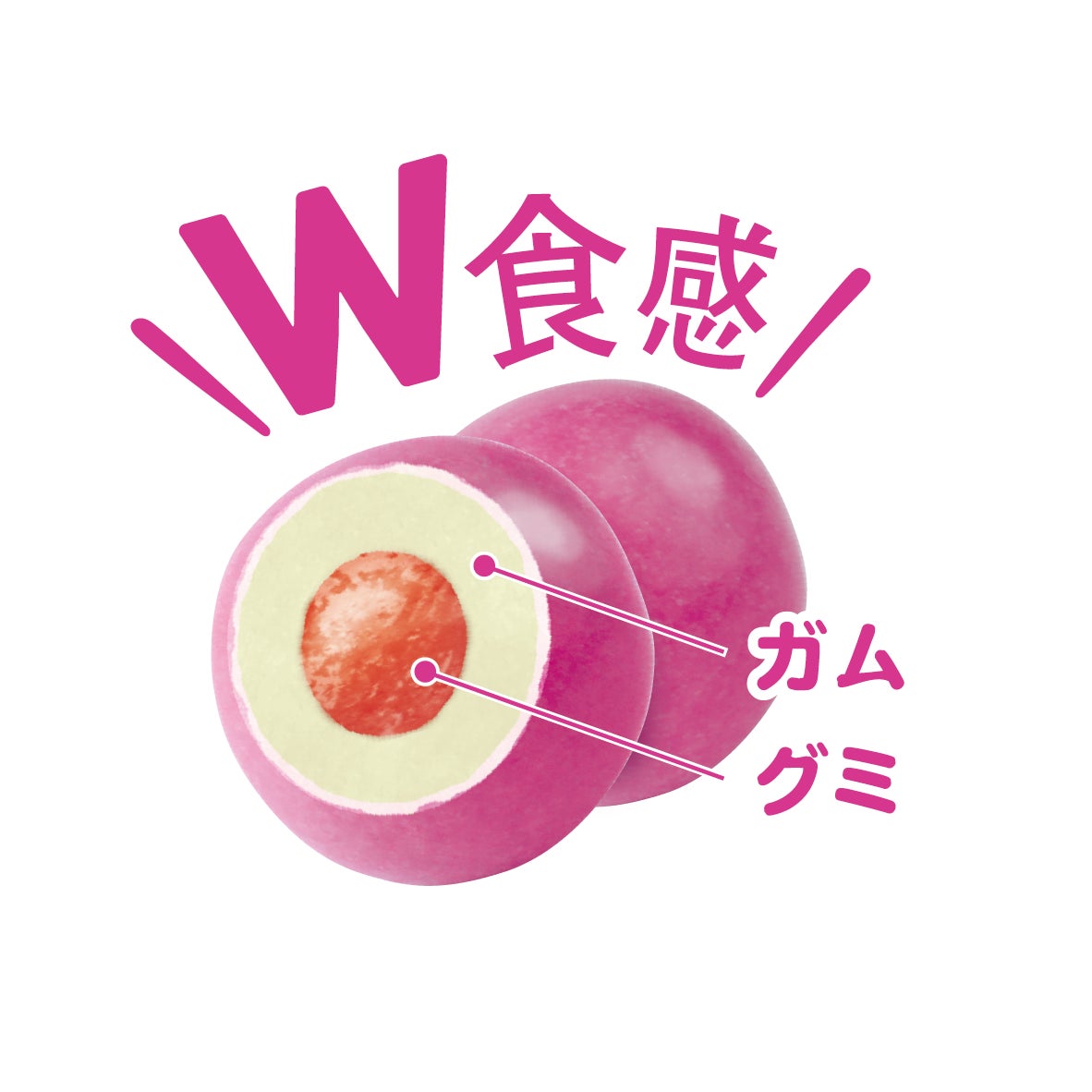 ぶどう果汁を配合し、ぶどうのジューシーな味わいが楽しめます。さらに噛んでいくとガムの中からグミがプルンと出てくるオリジナルダブル食感です。