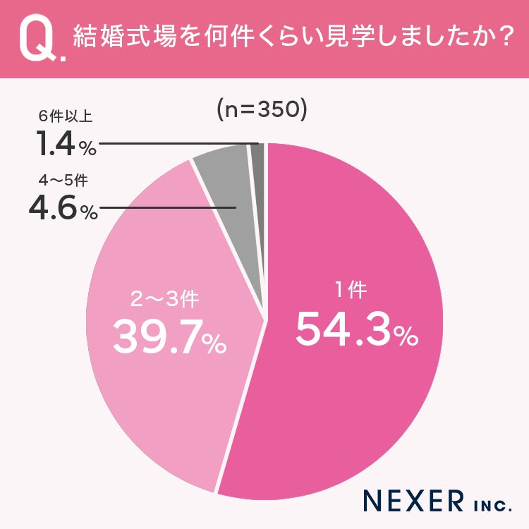 その結果「1件」が54.3%と半数以上を占め、「2~3件」が39.7%、「4~5件」が4.6%、「6件以上」が1.4%となりました。意外にも、複数の式場を比較することなく決定する方が多いようです。
