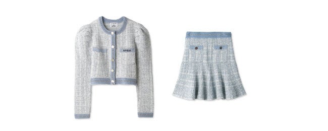 リミテッドコンセプトストアを開催するルミネエスト新宿店および阪急うめだ本店限定でツイードニットカーディガンとツイードニットスカートの【BLU】、デイジーニットトップスの【PNK】を販売いたします。