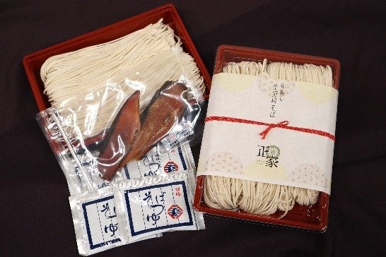 店内で打ち立ての生更科蕎麦と本枯節付き希釈つゆのセット。ご自宅で本格的なお蕎麦をご賞味ください。