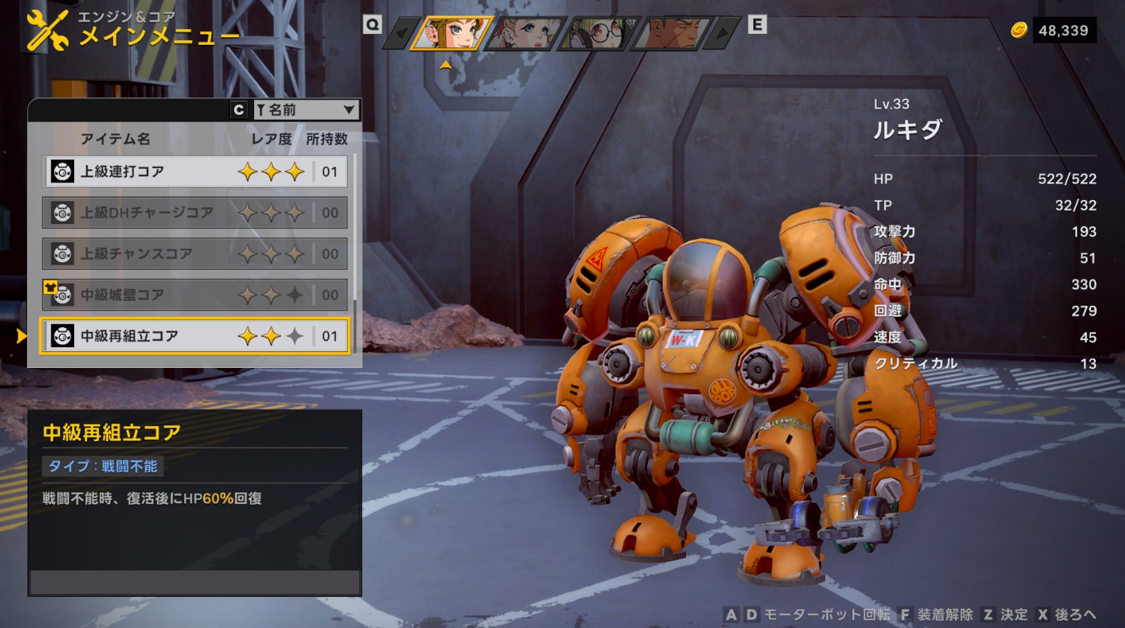メカは4つの部位にパーツを装備することが可能で、外見も変化する。さらに、エンジンをカスタマイズすれば、能力値上昇に加え、コアの装備が可能となる。コアを装備することで特定の条件下で発動するスキルを得られるため、自分の好みにあったカスタマイズが可能。