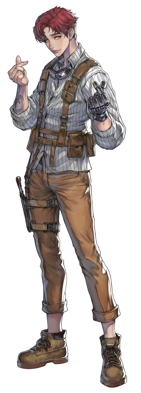 無口だが芯のある技術者。グウェンドル同様にディライトシティで暮らす、ルキダの頼れる仲間。険しい外見から誤解されることが多いが、性格が穏やかで話しやすい。見知らぬ人に接するのが苦手で、街の外部の人とはあまり交流しない。