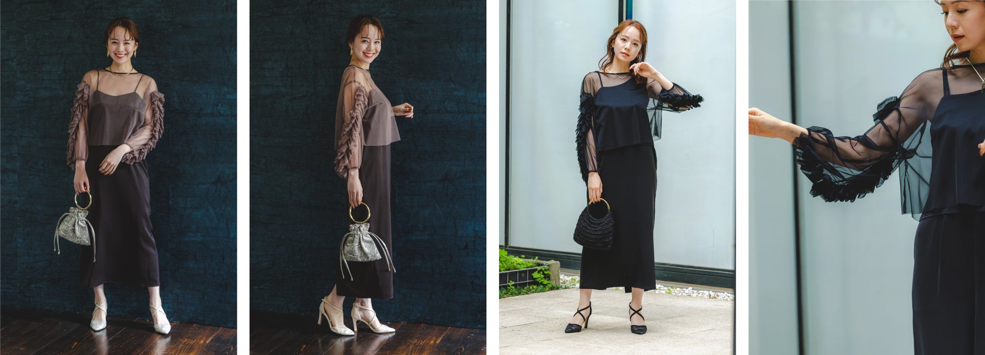 カジュアルなアイテムとの相性もよく、日常の食事会や、デートなどのさまざまなシーンでアレンジを楽しめる1着です。シンプルで上質なベースドレスに、いまっぽさをプラスする透け感やフリル、ワンショルダーなどのアレンジパーツを自在に合わせて、自分だけのオリジナルスタイリングを楽しめます。