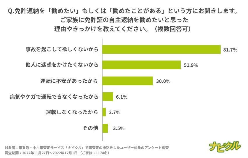 - 高齢者を持つ家族の7割以上が「自主返納を勧めたいと思う(勧めたことがある)」と回答。(72.1%)最も多い理由は「事故を起こして欲しくないから」。(81.7%)