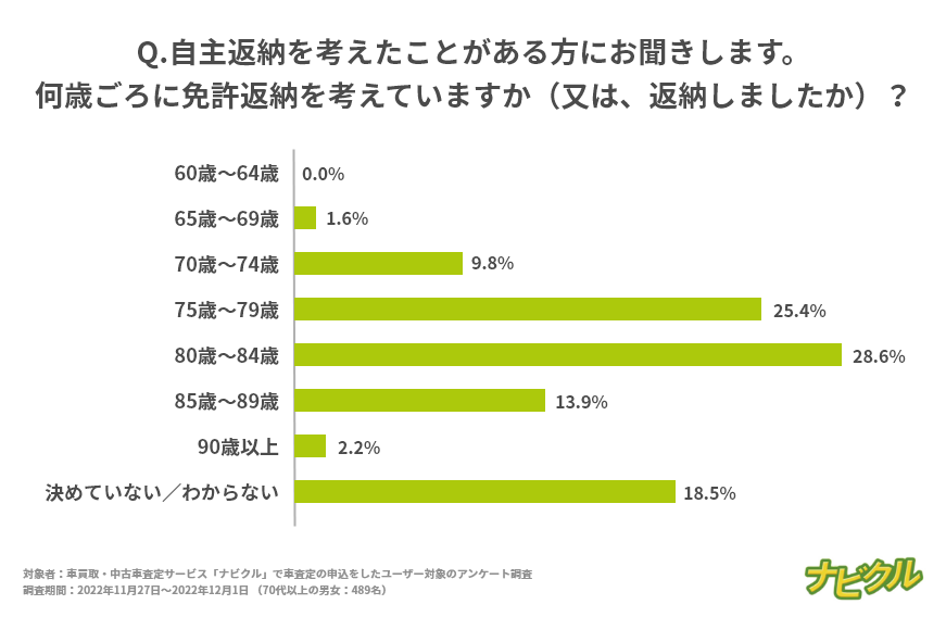 - 半数以上の高齢者が「75歳~84歳で自主返納を検討している」一方で、約2割の高齢者は「決めていない/わからない」と回答。当事者ながら結論を出せていないことが明らかに。