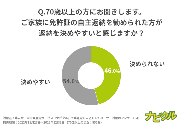 70歳以上の高齢者へ「家族に免許証の自主返納を勧められた方が決めやすいと感じるか?」と尋ねると、54.0%が「決めやすい」と回答する一方で、46.0%が「家族から勧められても決められない」と回答しました。