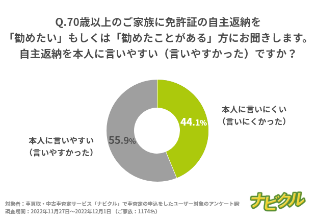 70歳以上の高齢者を家族に持ち、「本人に免許の自主返納を勧めたいと思う、もしくは勧めたことがある」と回答した方へ「免許証の自主返納を本人に言いやすかったか?」と尋ねると、約半数の家族が「言いにくい/言いにくかった」と回答しました。