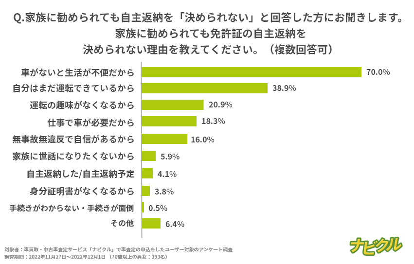 また、「家族から勧められても決められない」と回答した高齢者にその理由を聞くと、最も多い回答となったのは「車がないと生活が不便だから」70.0%、次いで「自分はまだ運転できているから」が38.9%となりました。