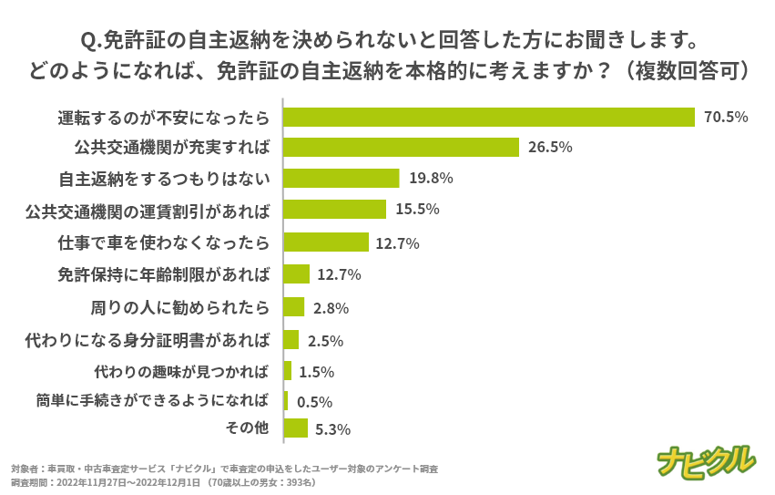 上記の質問に続けて、「将来どのようになれば免許を自主返納することを本格的に考えるか?」と尋ねたところ、「自分で運転するのが不安になったら」と回答した高齢者が最も多く、70.5%いることが明らかになりました。
