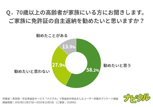 70歳以上の高齢者の家族に、「本人に免許の自主返納を勧めたいと思うか、もしくは勧めたことがあるか」と尋ねると、58.2%の家族が「勧めたいと思う」と回答。そして13.9%の家族が「勧めたことがある」と回答しました。