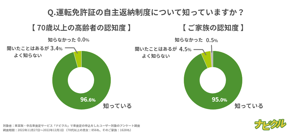 ●70代以上の運転免許の自主返納制度についての認知度は96.6%!その家族も95%が運転免許の自主返納制度について知っていることが明らかに。