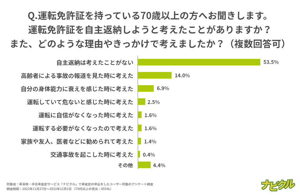 70歳以上の高齢者への「運転免許証を自主返納しようと考えたことがありますか?」という質問では、53.5%が「自主返納は考えたことがない」と回答しました。