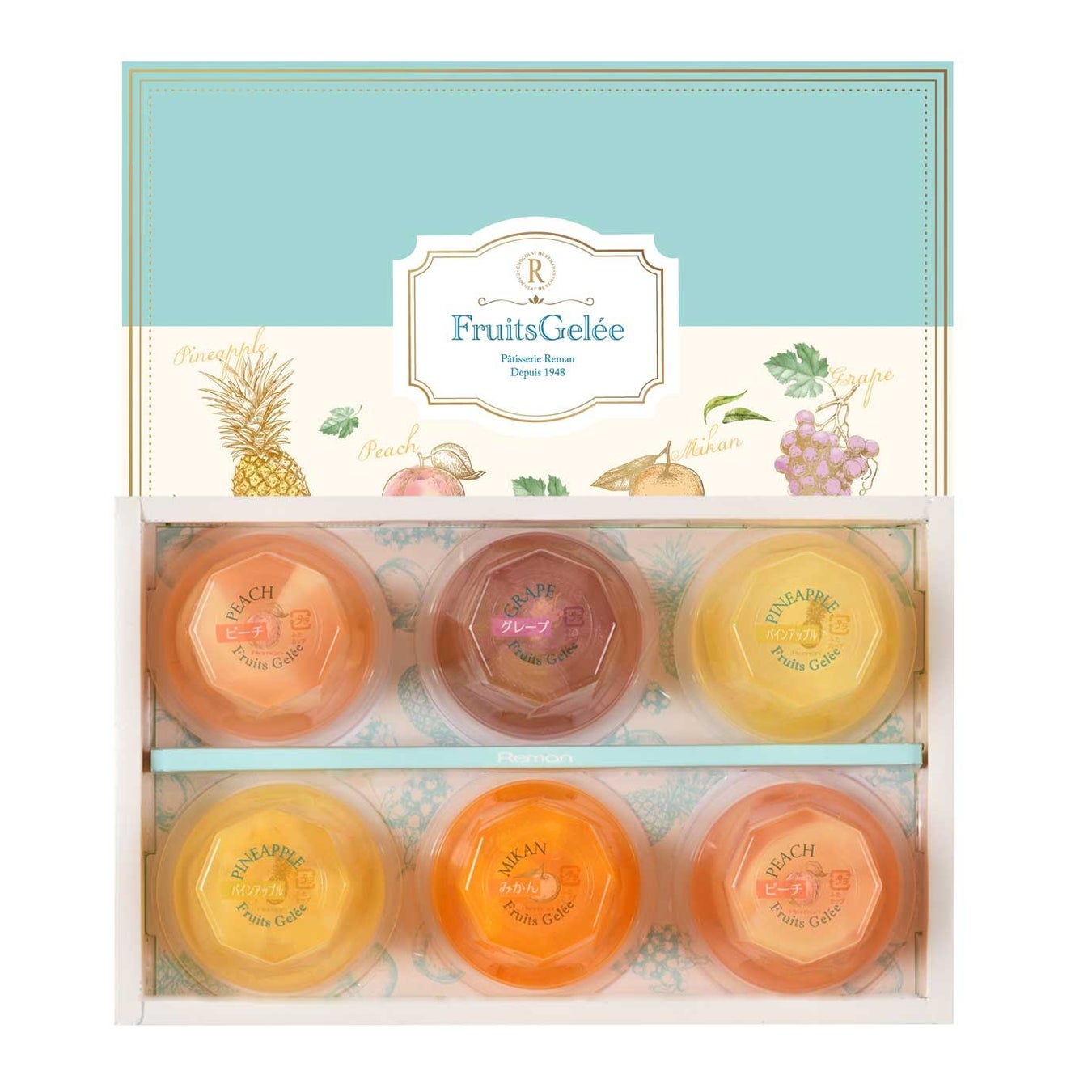 グレープ、パインアップル、ピーチ、みかんの全4種類の果肉がたっぷり入ったジュレです。