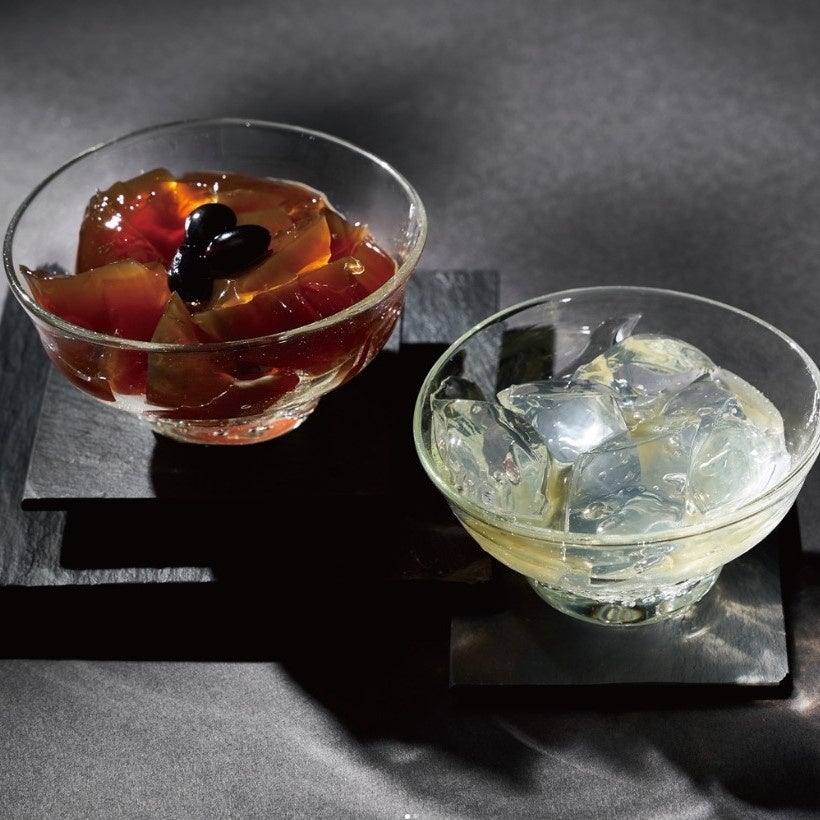 季節限定の丹波黒豆を使用した黒糖羹と天然水を使用した爽やかな水ゼリーです。