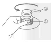 ●キャップ(1)を手で固定し、ノズル(2)を矢印の方向に回すと頭部が上がります。(上がらない場合は、キャップを閉めなおして再度回してください。