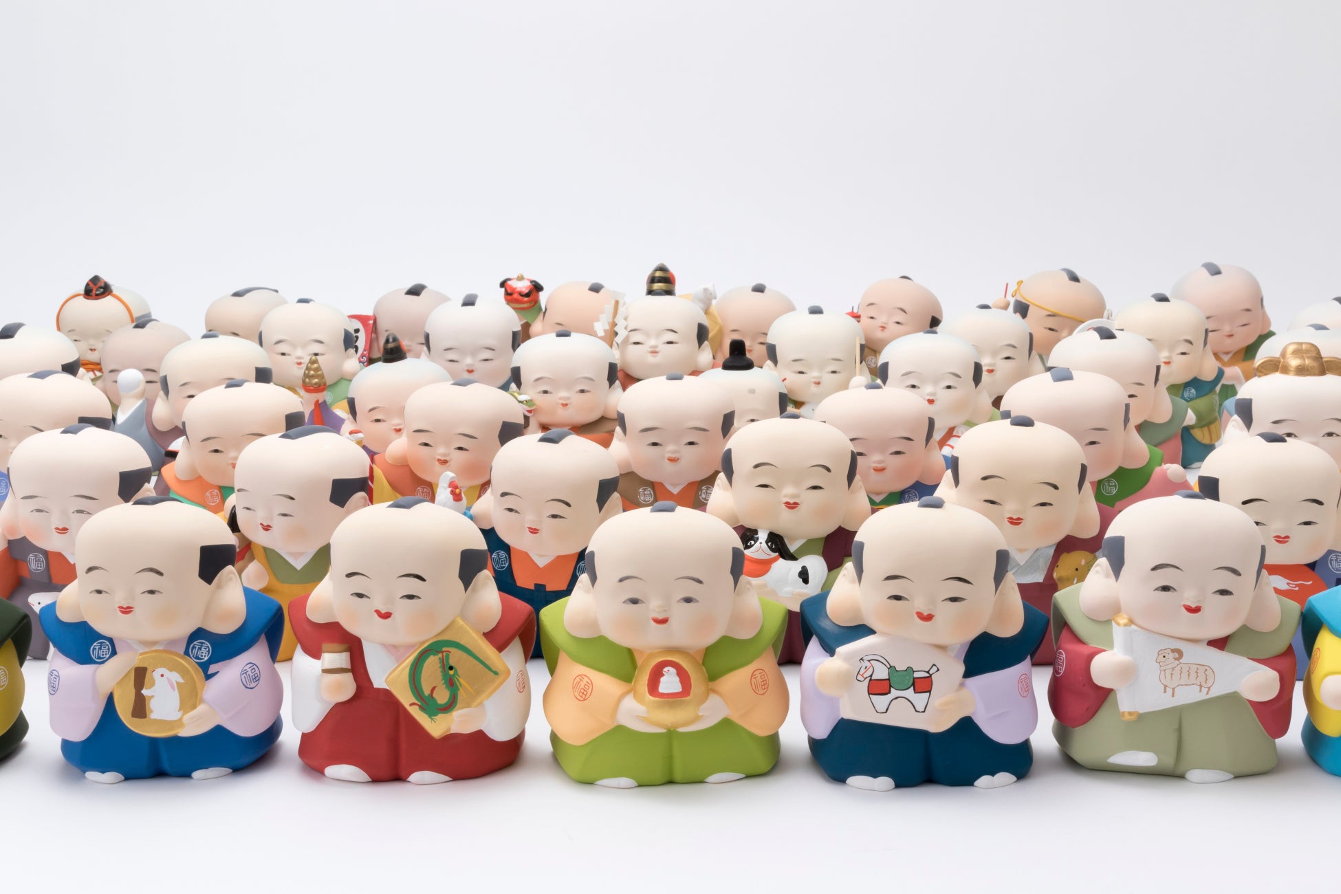 京人形師の宮崎隆先生によって作られており、熱心なコレクターの方も多いレアな人形です。このたびのポップアップイベントでは、この「福助干支人形」の過去の作品を販売いたします。