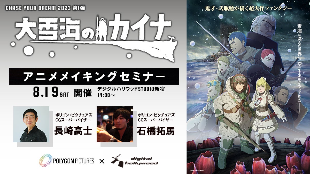 第1弾は、8月19日(土)に、Polygon PicturesのCGスーパーバイザーで、デジタルハリウッド(専門スクール)の卒業生である長崎高士(ながさき たかし)氏にご登壇いただき、TVアニメ『大雪海のカイナ』のメイキングセミナーを開催いたします。