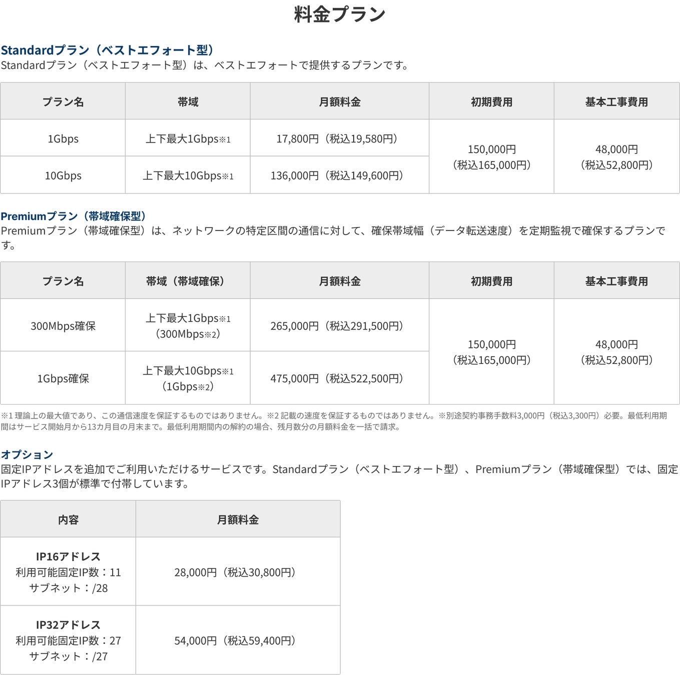 本サービスはお客様のご利用ニーズに合わせ、300Mbpsと1Gbpsの2つの帯域からプランをお選びいただけます。300Mbpsプランは、月額291,500円(税込)で300Mbpsの帯域を確保し、最大速度は1Gbpsとなります。1Gbpsプランは、月額522,500円(税込)で1Gbpsの帯域を確保し、最大速度は10Gbpsとなり、低価格でストレスフリーな通信をご利用いただけます(注3)。また、「KŌSOKU Access Standardプラン(ベストエフォート型)」同様、2年以上ご利用いただくことで初期費用・基本工事費用を実質無料でご提供します(注4)。