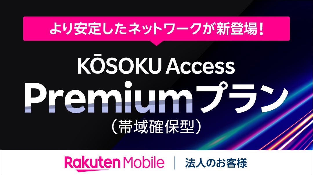 楽天モバイル株式会社(以下「楽天モバイル」)は、本日8月30日(金)から、法人のお客様向け超高速インターネットサービス「KŌSOKU Access」の新プランとして、新たに一定の帯域幅を確保する「KŌSOKU Access Premiumプラン(帯域確保型)」(以下「本サービス」)の提供を開始しました(注1)。本サービスは、お客様のご利用状況に合わせて300Mbpsと1Gbpsの2つの帯域からプランをお選びいただけます。