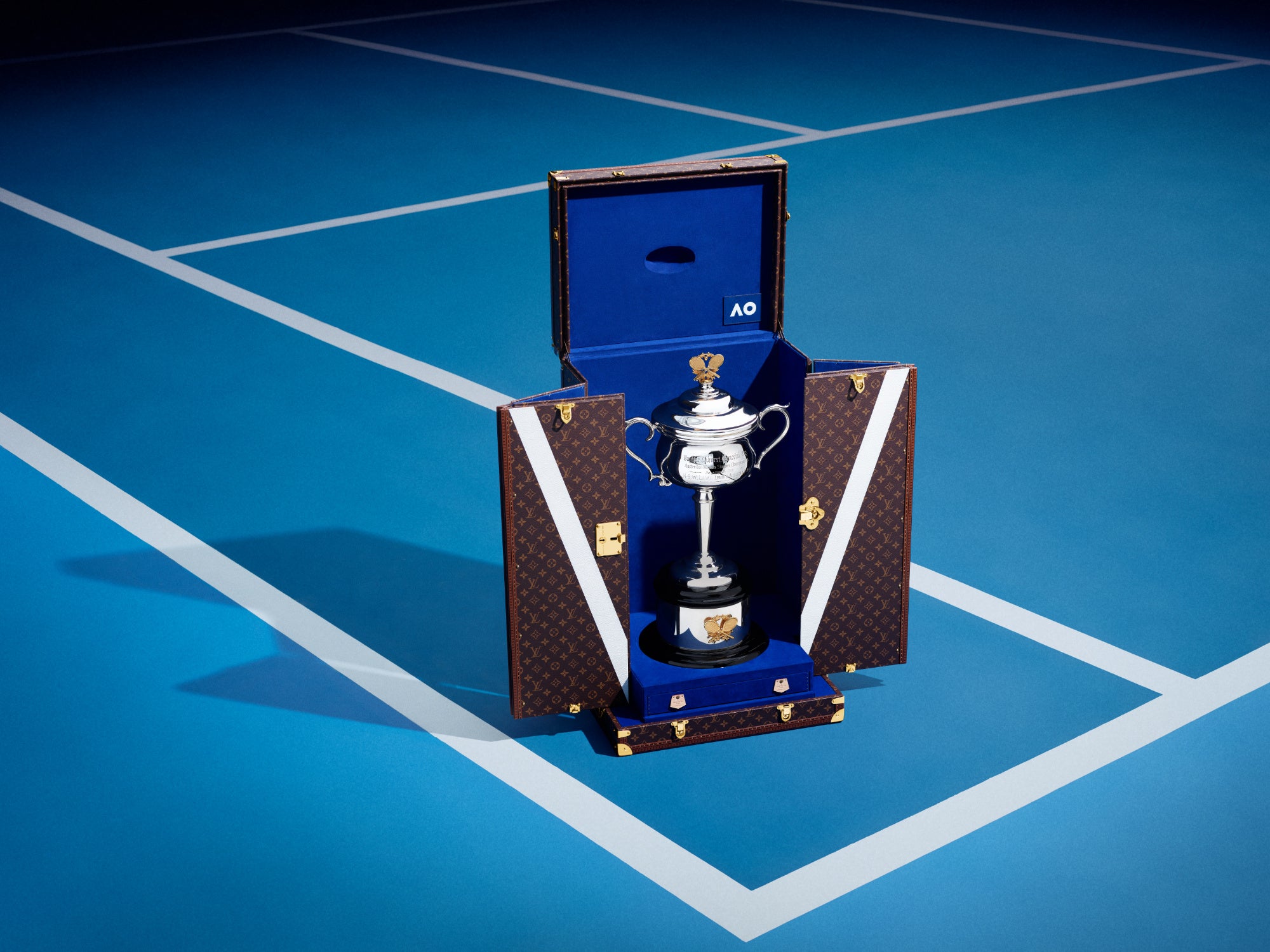 パリ郊外のアニエールに構える歴史的なルイ・ヴィトンのアトリエにて、熟練の職人たちの手作業によって製作されたこのトランクは、グランドスラムの幕開けとなる全豪オープンの初日から、トロフィーを大切に守り、運んできました。木製のフレームは、象徴的なルイ・ヴィトンのモノグラム・キャンバスで覆われ、1860年代からルイ・ヴィトンのトランクに使用されてきたものと同じ、伝統的なロジンのトリミングや真鍮製のコーナー金具、ロック(錠前)、クラスプで仕上げられています。2枚のフロントパネルは折り畳むとトロフィーが現れる仕組みになっており、印象的なホワイトカラーで「Victory」と「Vuitton」を意味する「V」が描かれています。トランクには、全豪オープンのブルーのコートから着想を得たカラーパレットに合わせ、ブルーのマイクロファイバーをライニングに採用。さらに蓋の内側には、全豪オープンのロゴ「AO」が、ホワイトであしらわれています。