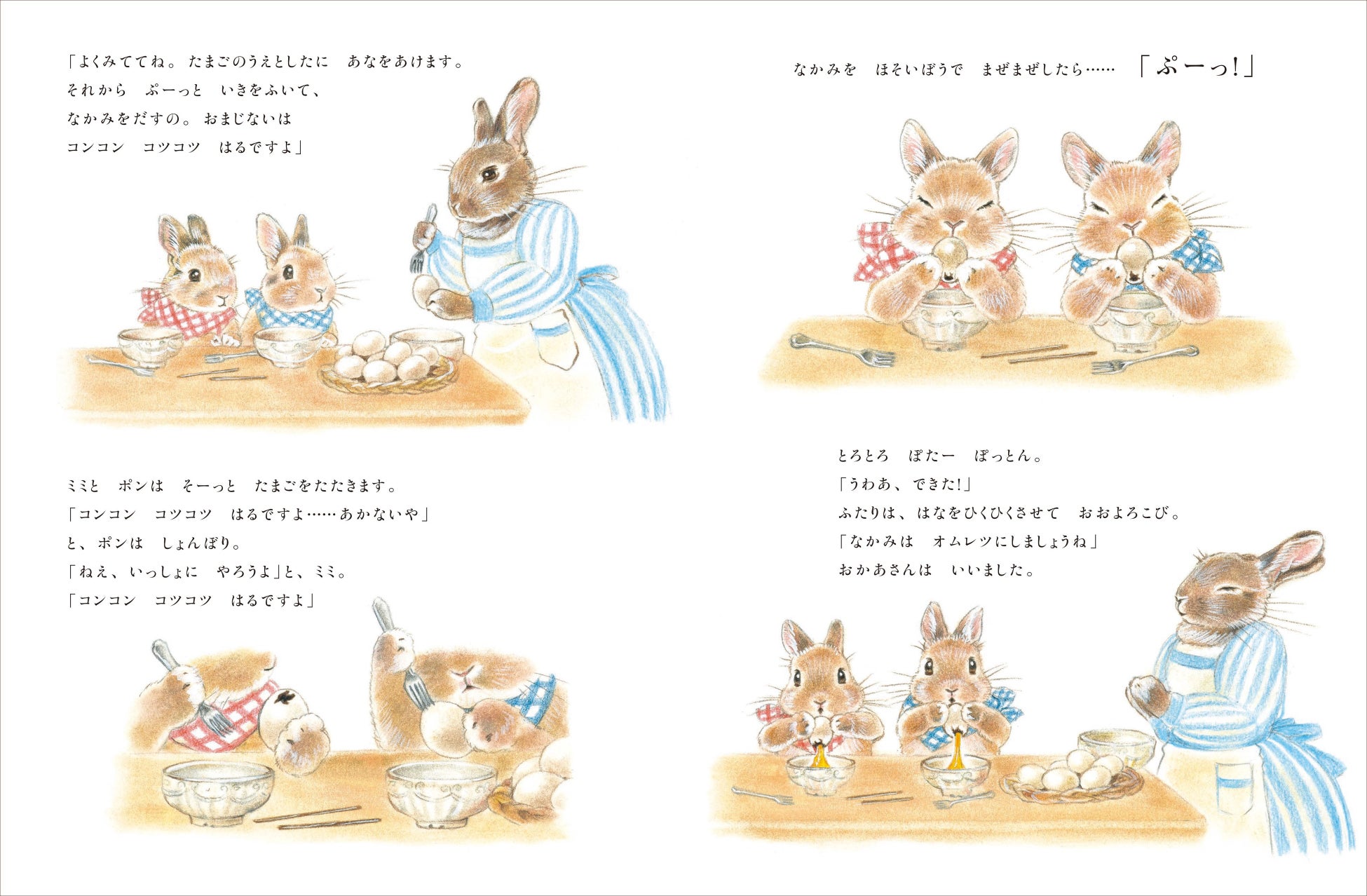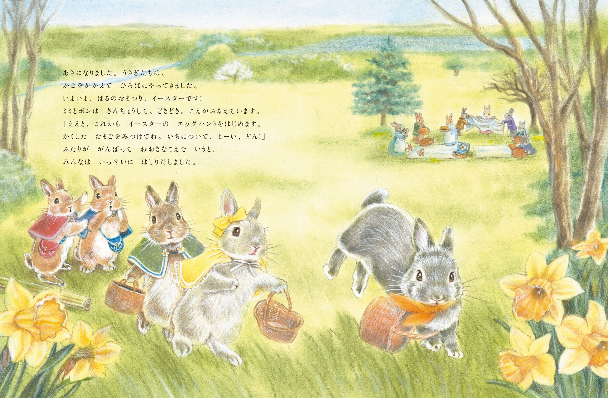 ふたごうさぎのミミとポンは、ことしはじめての「イースターうさぎ」のおとうばん。イースターエッグをつくったり、エッグハントのじゅんびをしたりと、大いそがしです。