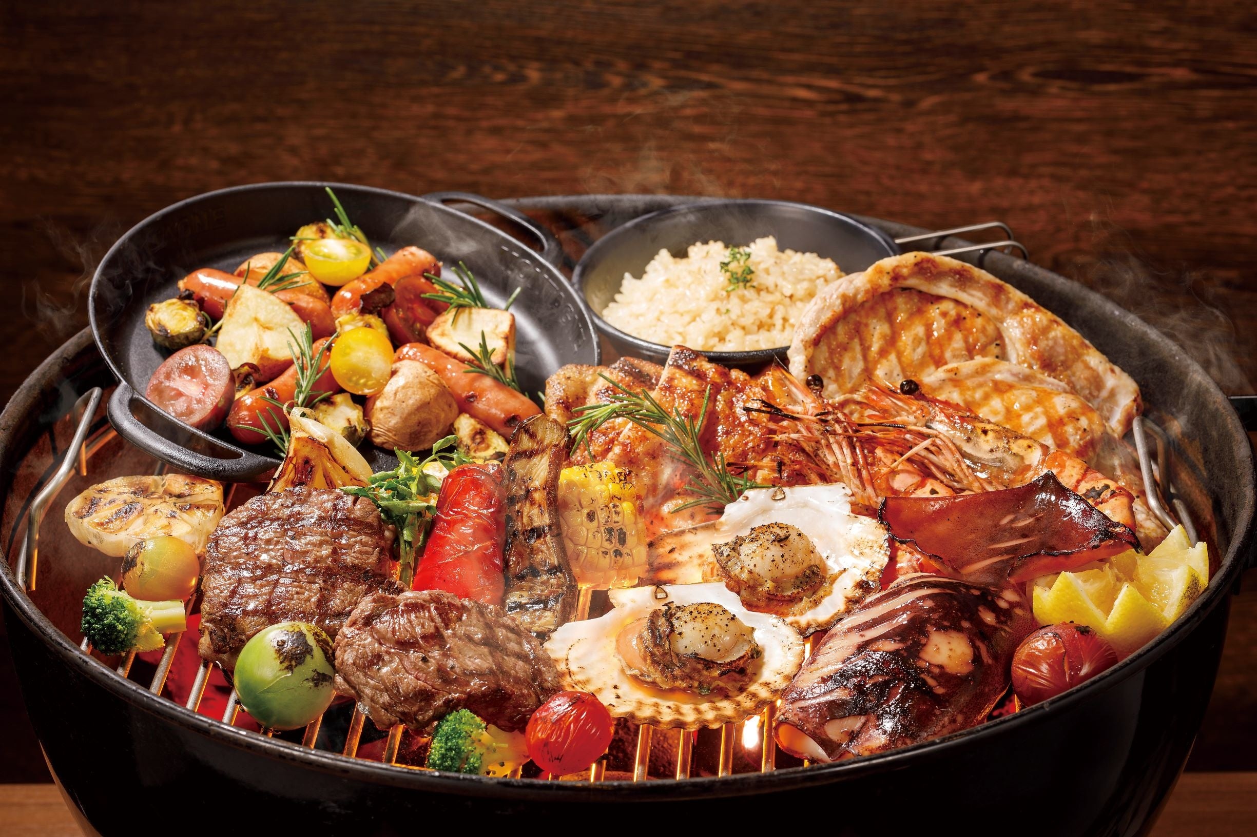 グリルで焼きながらお召し上がりいただくお肉や季節の野菜、生ビールをはじめ20種類以上のドリンクの飲み放題メニューがお楽しみいただけます。