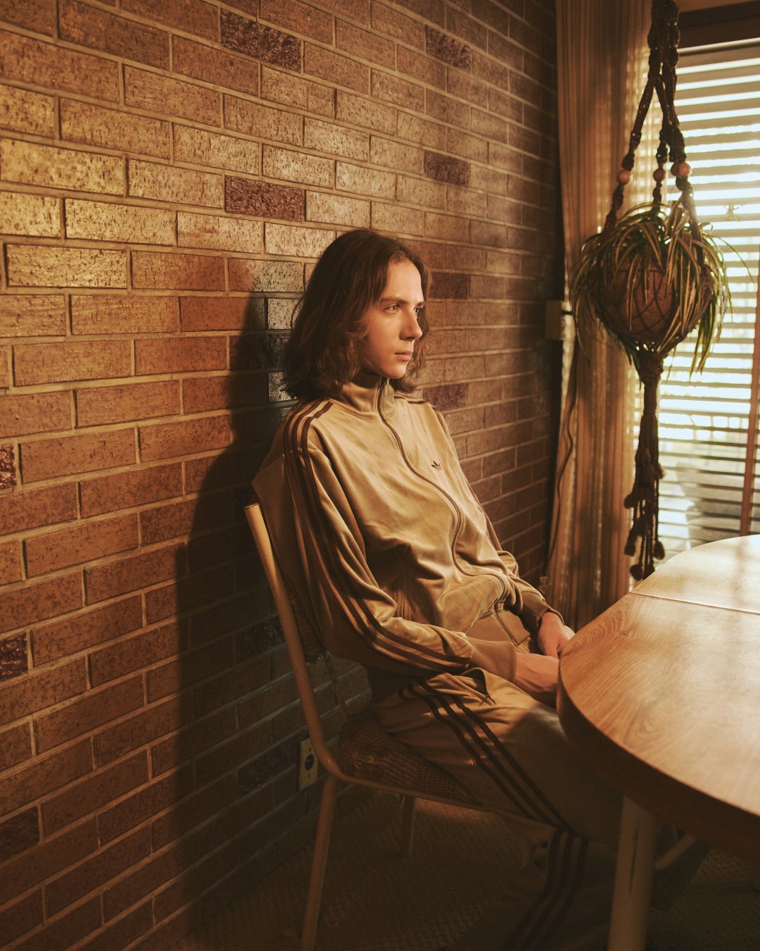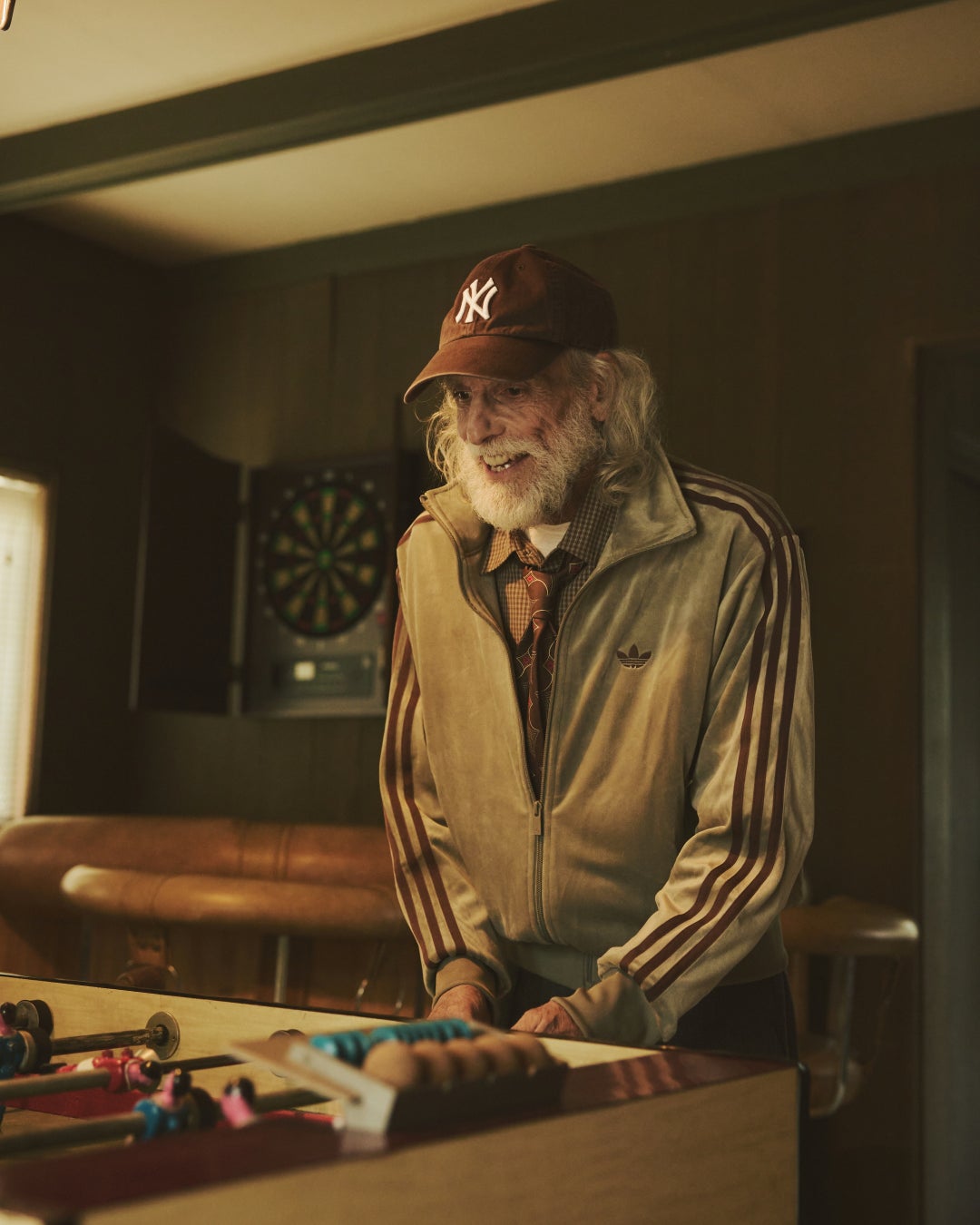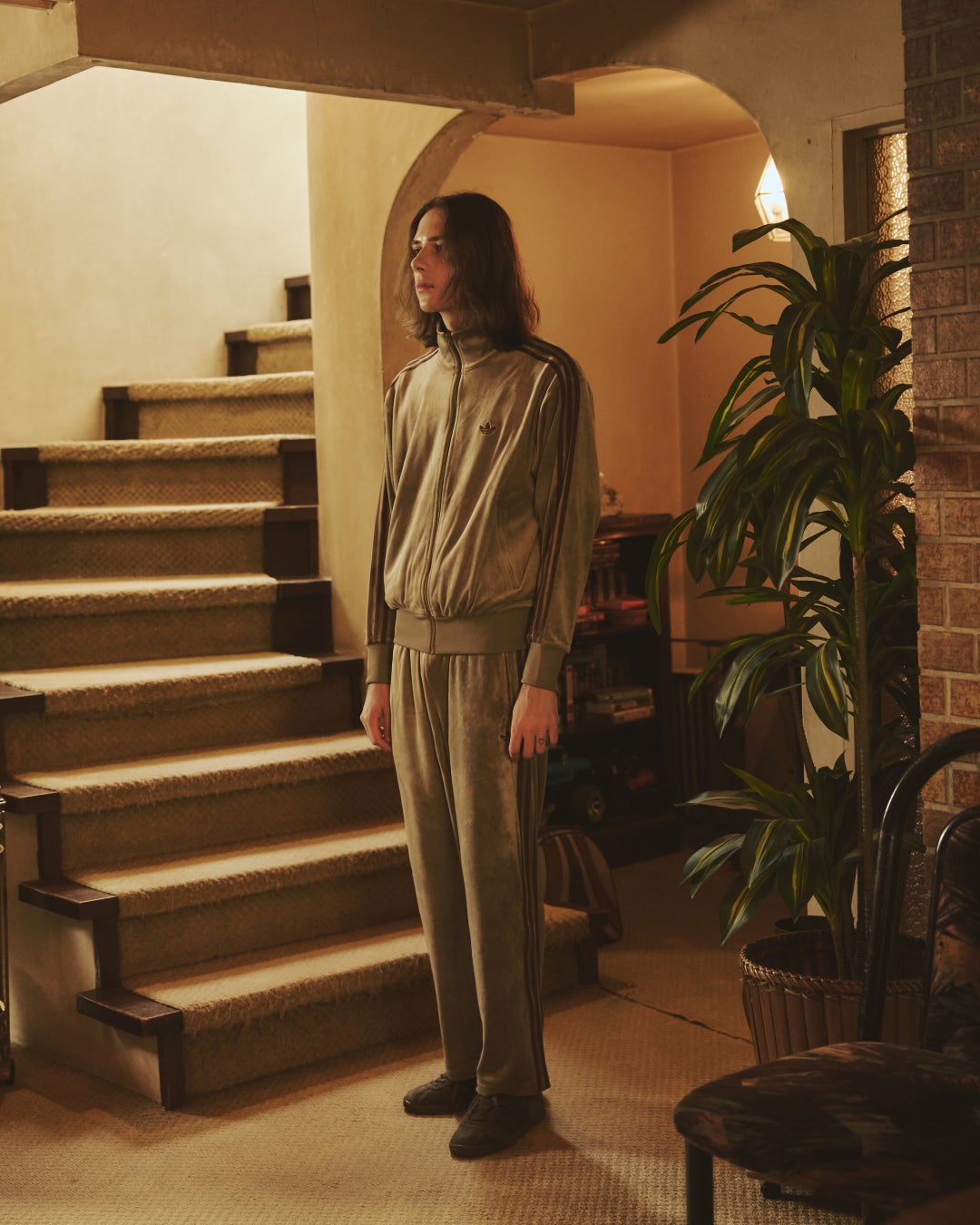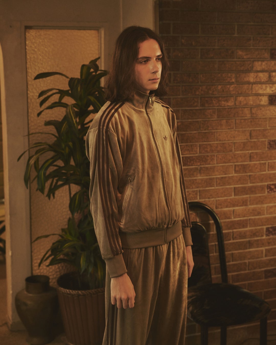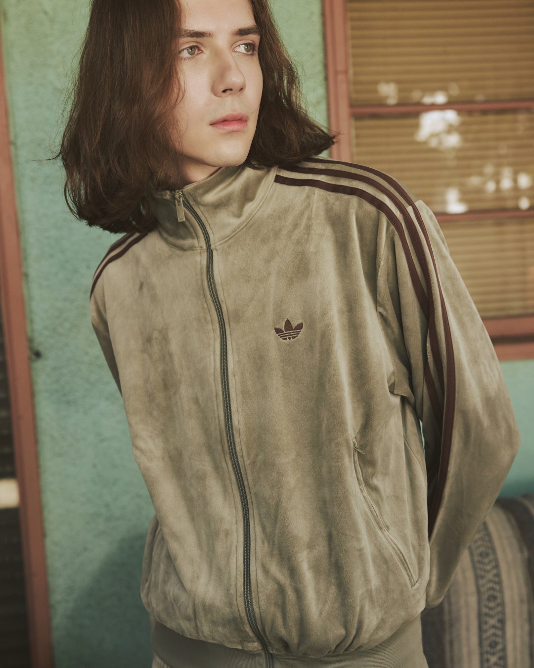 ルーズフィットのトラックトップは、ベロア素材ならではの柔らかな光沢を持ち、レトロなデザインに高級感とラグジュアリー感を添えています。