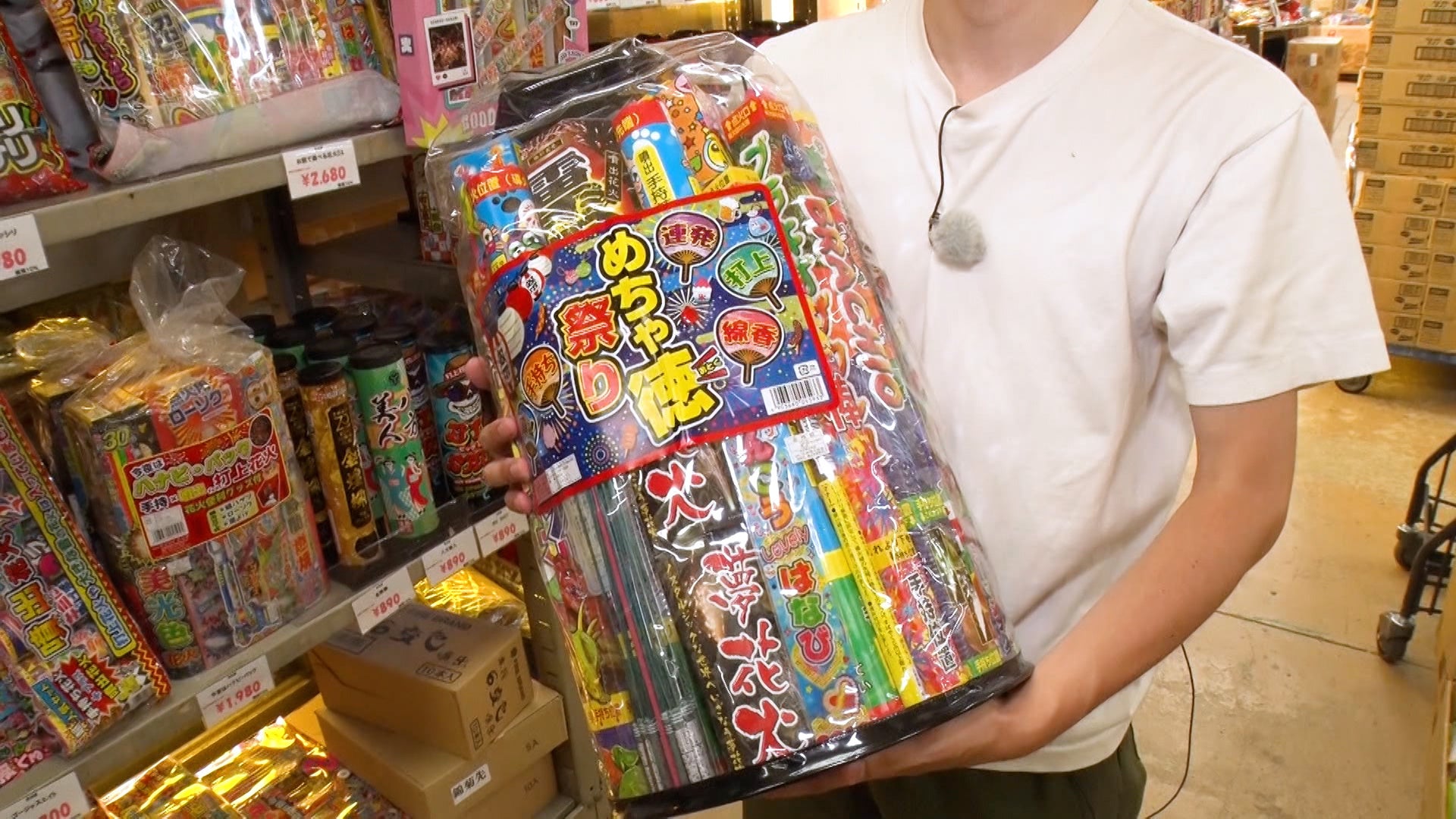 花火の専門店ではなく、実は駄菓子屋の一角に花火が盛りだくさんで展示されているお店。大容量のセット花火は特に人気で、30種以上の花火が入った、ボリューム感抜群のセットが半額で購入可能!また、スタジオ一同納得の「お菓子屋さんに花火が置いてある理由」とは?