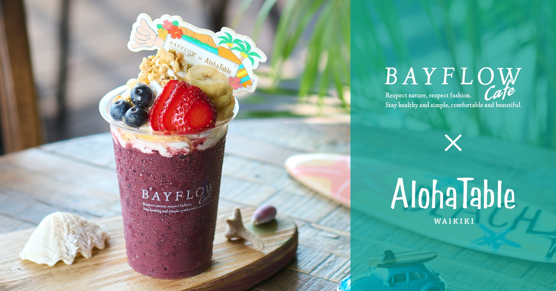 今回コラボレーションする「Aloha Table」はワイキキに本店を構え、アイランド・カルチャー、ライフスタイルを提案するハワイアンカフェ&ダイニングです。「BAYFLOW café」にも家族やカップルの来店が増える夏休みシーズンに、南国ハワイを感じられるメニューを楽しんでもらうため、「Aloha Table」コラボのスペシャルドリンクを開発しました。
