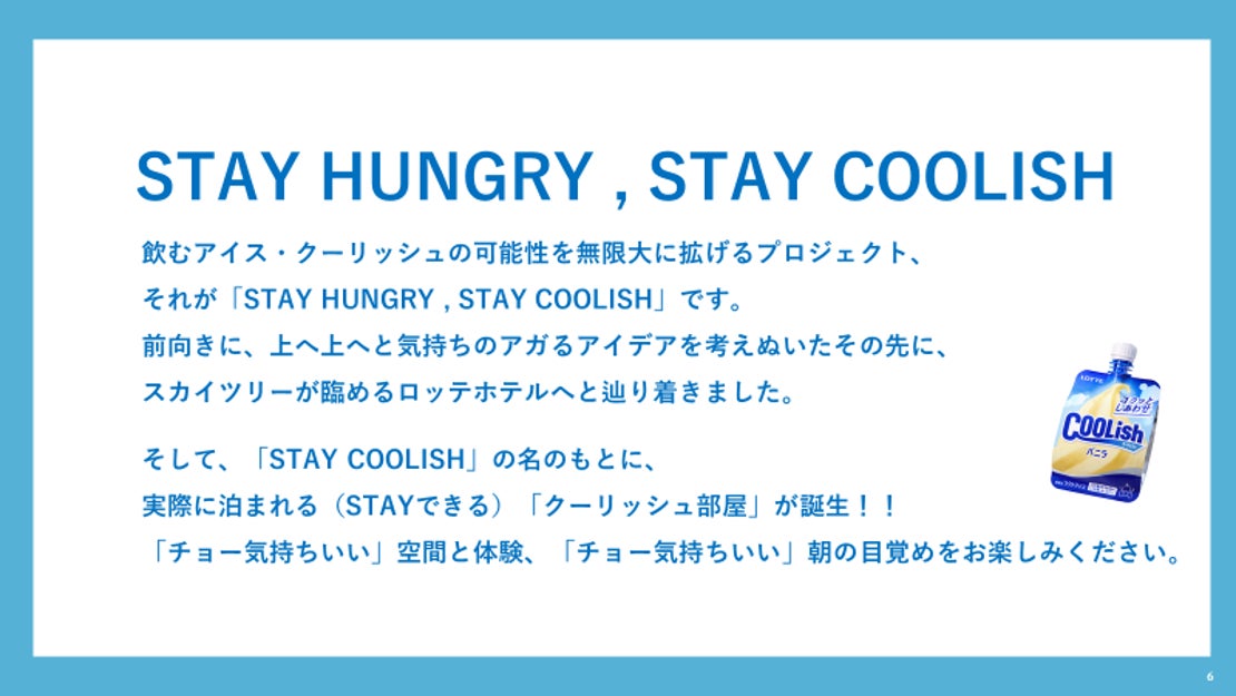 本コラボレーションは、クーリッシュの可能性を無限大に拡げるプロジェクト「STAY HUNGRY, STAY COOLISH」のコンセプトにロッテシティホテル錦糸町が賛同し、「東京スカイツリー®を客室の窓から眺めながら飲むクーリッシュは格別なのではないか」との思いのもと、お客さまに「チョー気持ちいい時間」を過ごしていただきたく、実現しました。