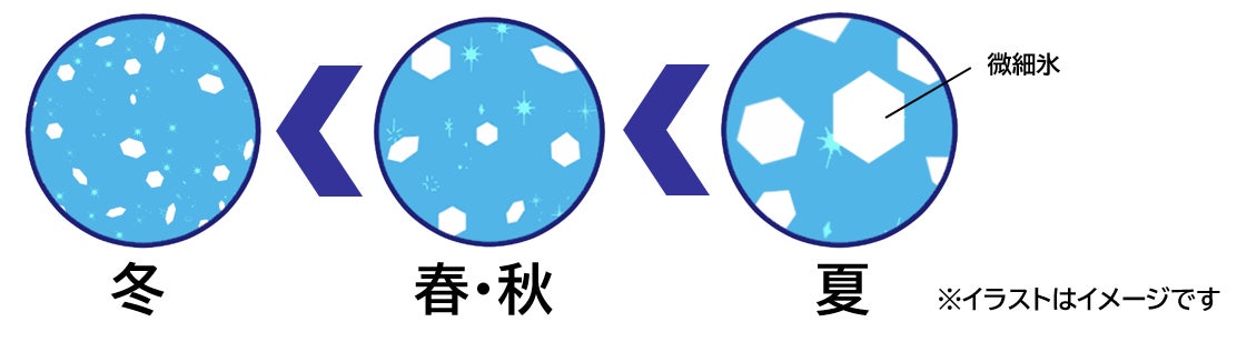 「クーリッシュ バニラ」は、季節で氷のサイズや味わいを変えています。「夏のクーリッシュ部屋」では「通常品質(春・秋)」、「夏季限定品質」、「冬季限定品質」の3つの「クーリッシュ バニラ」の飲み比べが可能です。「夏季限定品質」は、春・秋に使用している微細氷と比較しサイズが大きく、より強い冷涼感とシャリッとした食感が楽しめます。また、「冬季限定品質」については、春・秋よりも微細氷を小さくすることでマイルドな冷涼感と、よりなめらかな食感を楽しむことができます。違いをぜひ体感してみてください。