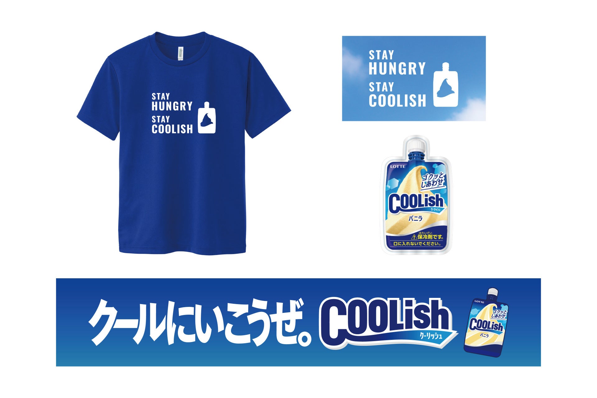 「STAY HUNGRY, STAY COOLISH Tシャツ」「STAY HUNGRY, STAY COOLISHオリジナルステッカー」「クーリッシュオリジナル保冷剤」「クールにいこうぜ。マフラータオル」(全て非売品)をご宿泊者限定特典としてお部屋にご用意しております。