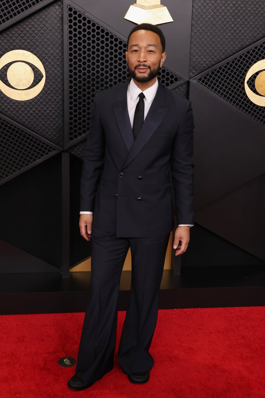 ジョン·レジェンドは、グラミー賞のレッドカーペットにて、ネイビーブルーのダブルブレストタキシードジャケットにネイビーのフレアパンツ、ホワイトシャツ、ブラックのサテンタイ、そしてジャズローファーを合わせました。
