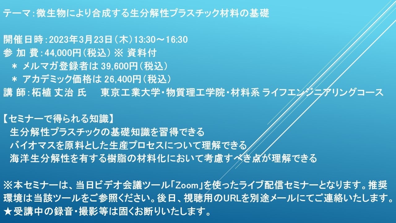 先端技術情報や市場情報を提供している(株)シーエムシー・リサーチ(千代田区神田錦町: https://cmcre.com/ )では、 各種材料・化学品などの市場動向・技術動向のセミナーや書籍発行を行っておりますが、 このたび「微生物により合成する生分解性プラスチック材料の基礎」と題するセミナーを、 講師に柘植 丈治 氏 (東京工業大学・物質理工学院・材料系 ライフエンジニアリングコース)をお迎えし、2023年3月23日(木)13:30より、 ZOOMを利用したライブ配信で開催いたします。 受講料は、 一般:44,000円(税込)、 弊社メルマガ会員:39,600円(税込)、 アカデミック価格は26,400円(税込)となっております(資料付)。