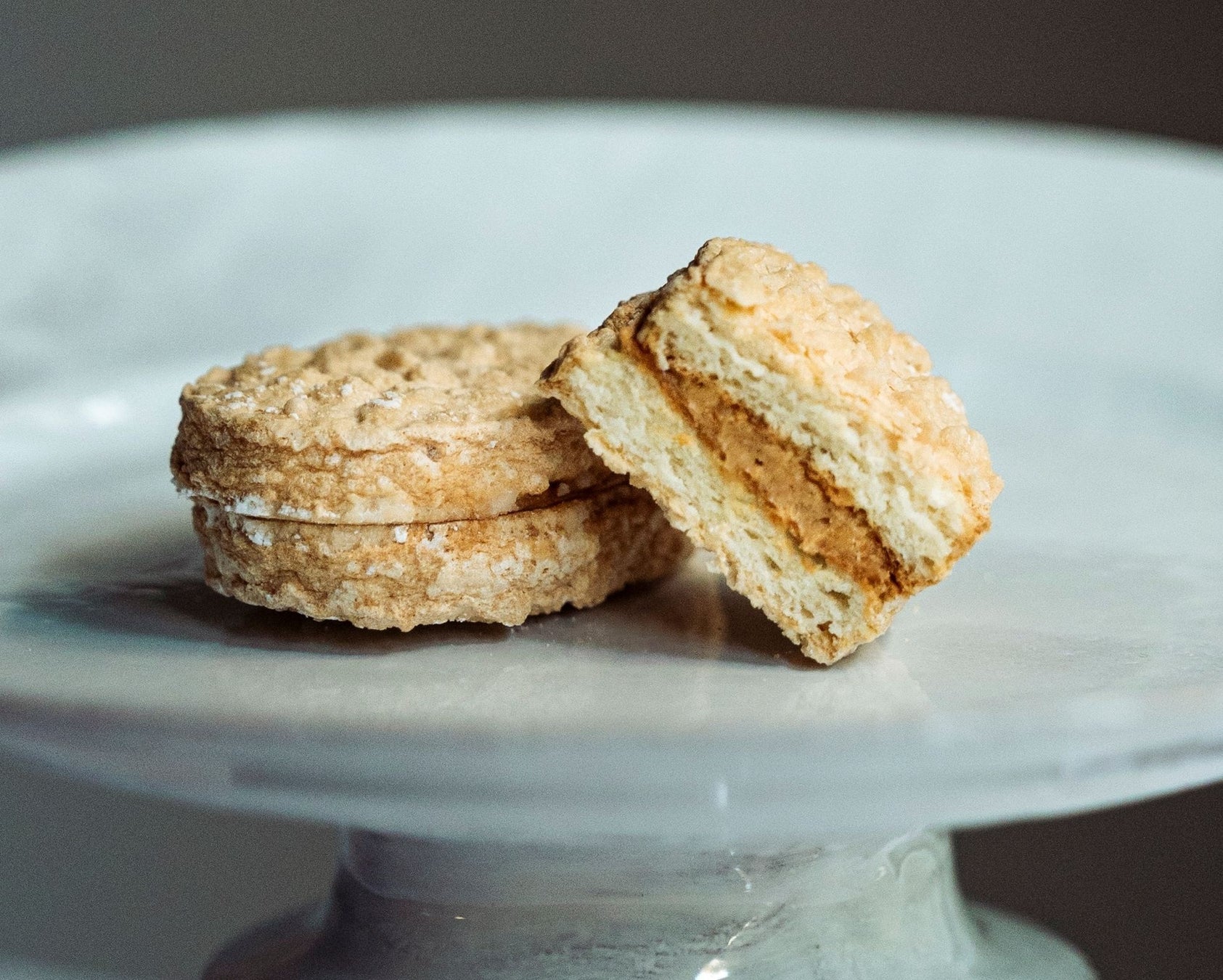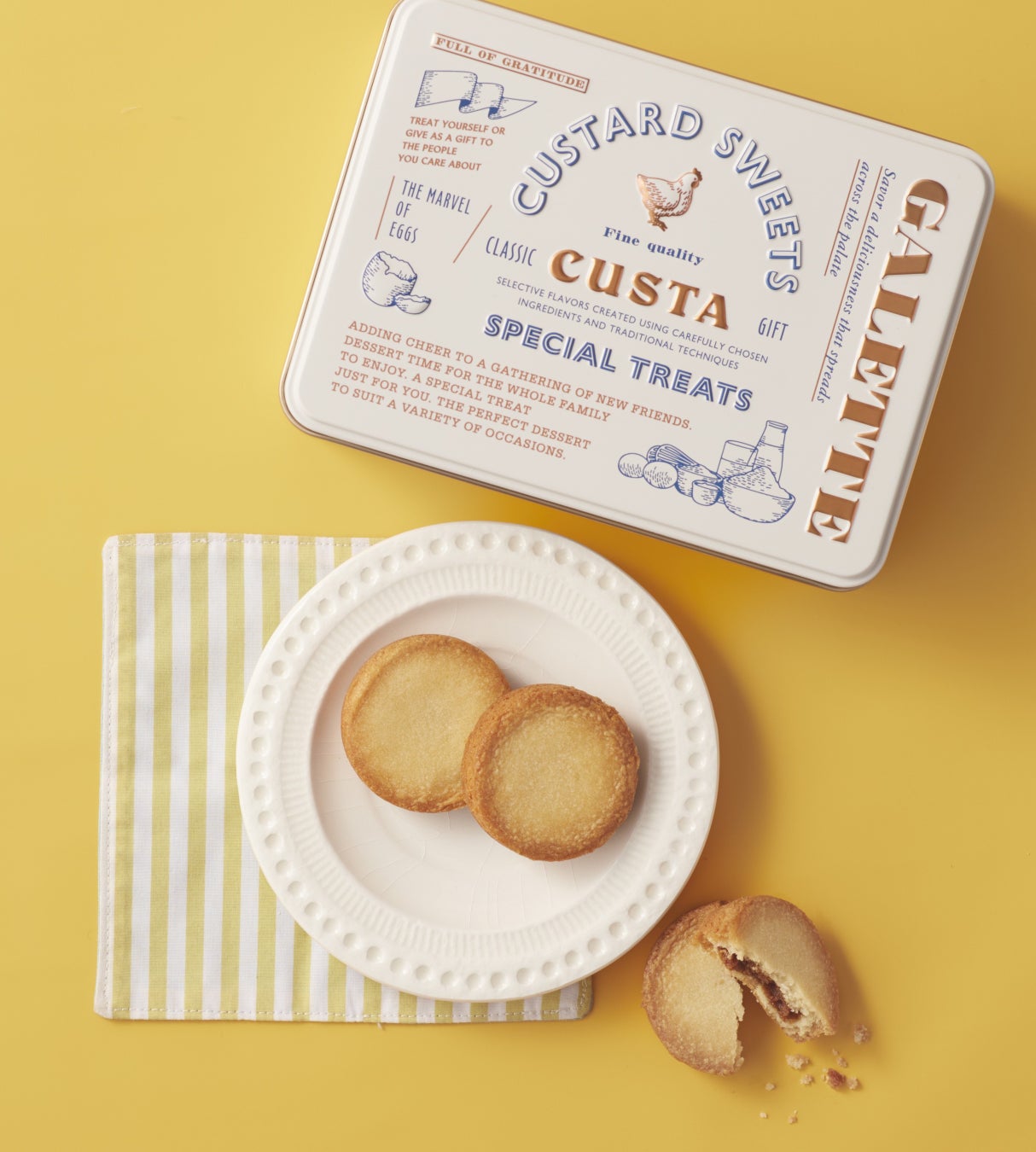 たまごの風味豊かなクッキーで、ほろ苦いキャラメルフィリングを包み込み、ほろほろとした食感に。