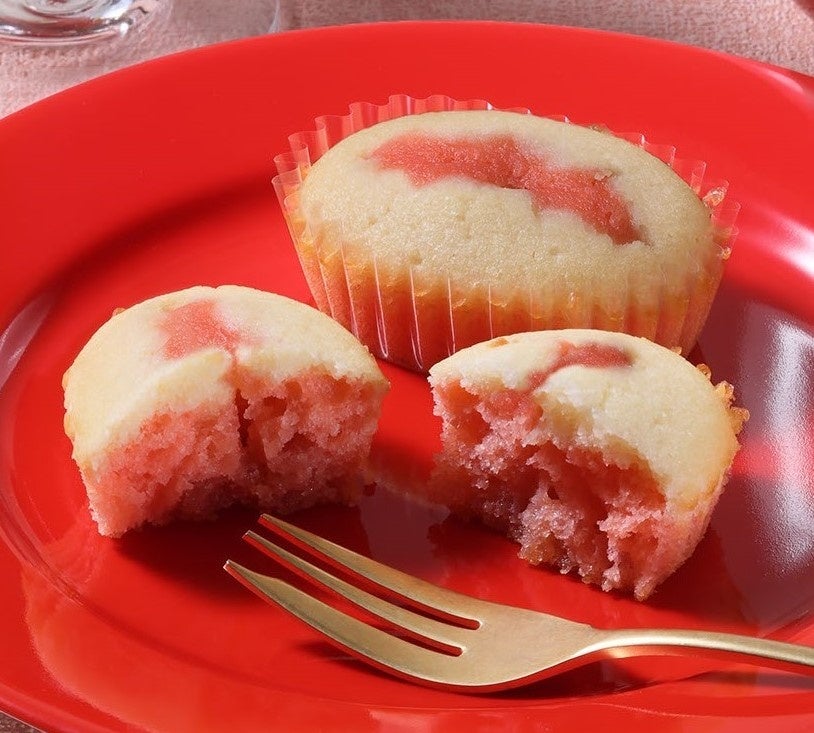 コーヒー風味のいちごシロップを染み込ませた生地に、ミルクたっぷりの生地を重ねて、いちごミルクラテを表現。