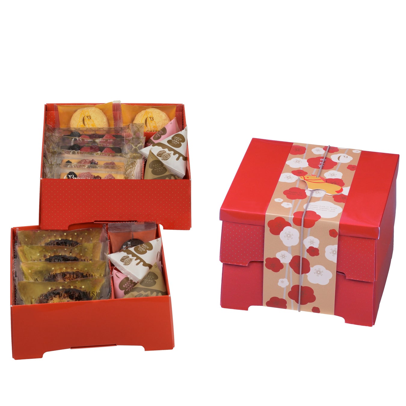 シーキューブの人気商品「焼きティラミス」をはじめ、3種のベリーが華やかに盛り付けられた「カカオベリーウィッチ」「ベリーウィッチ」、さくほろ食感のクッキー「サクッチ・ホロッチ」など8種類が楽しめる、迎春限定のお重アソートです。