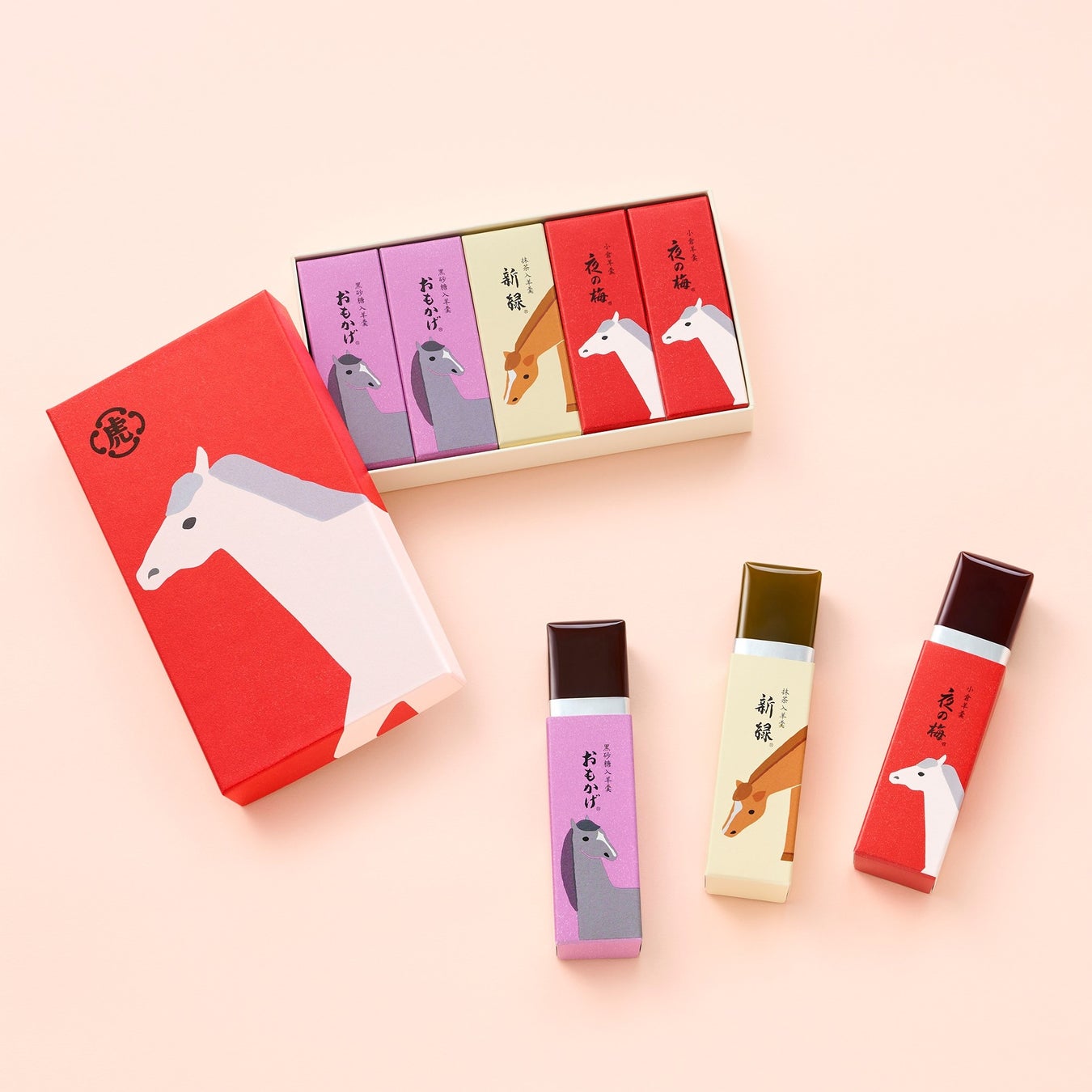 新年にふさわしい華やかな紅色を背景に、優しい表情のゆったりとした馬の姿を配した限定の化粧箱に、干支パッケージの小形羊羹を詰め合わせました。