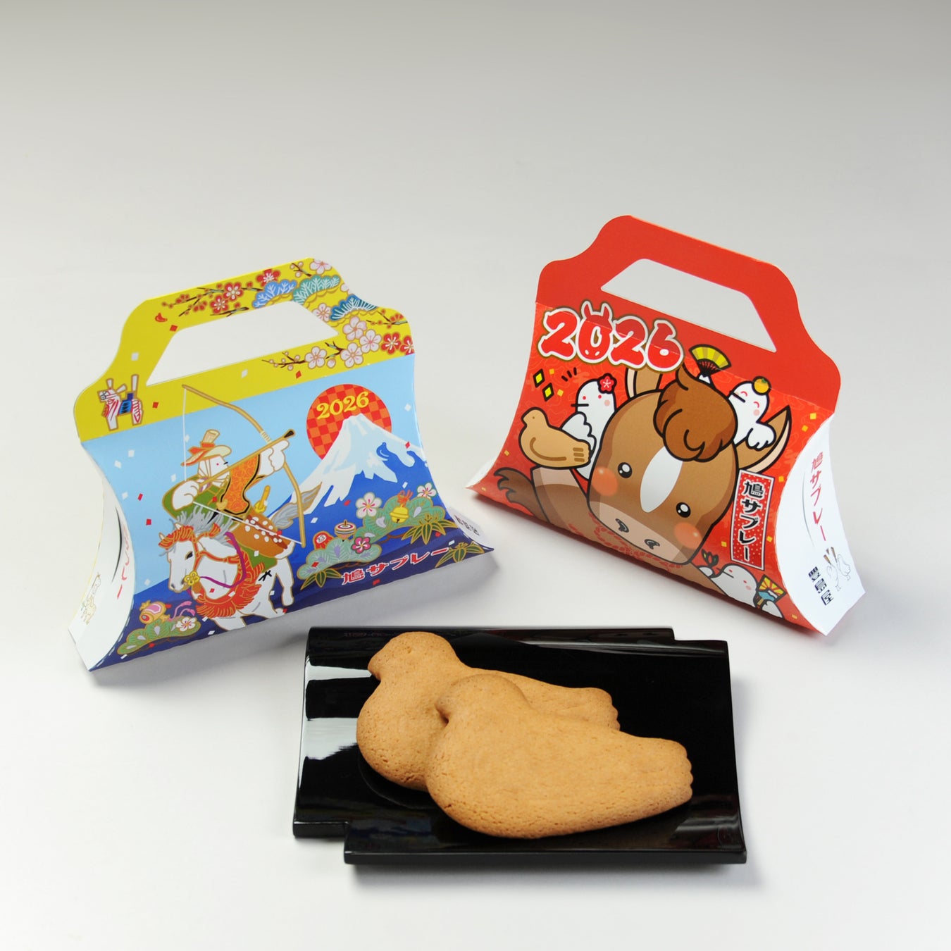 干支をデザインした限定パッケージです。キュートな馬が主役のデザインと、流鏑馬を描いたデザインの2種類をご用意しています。価格:各616円(1箱、4枚入)